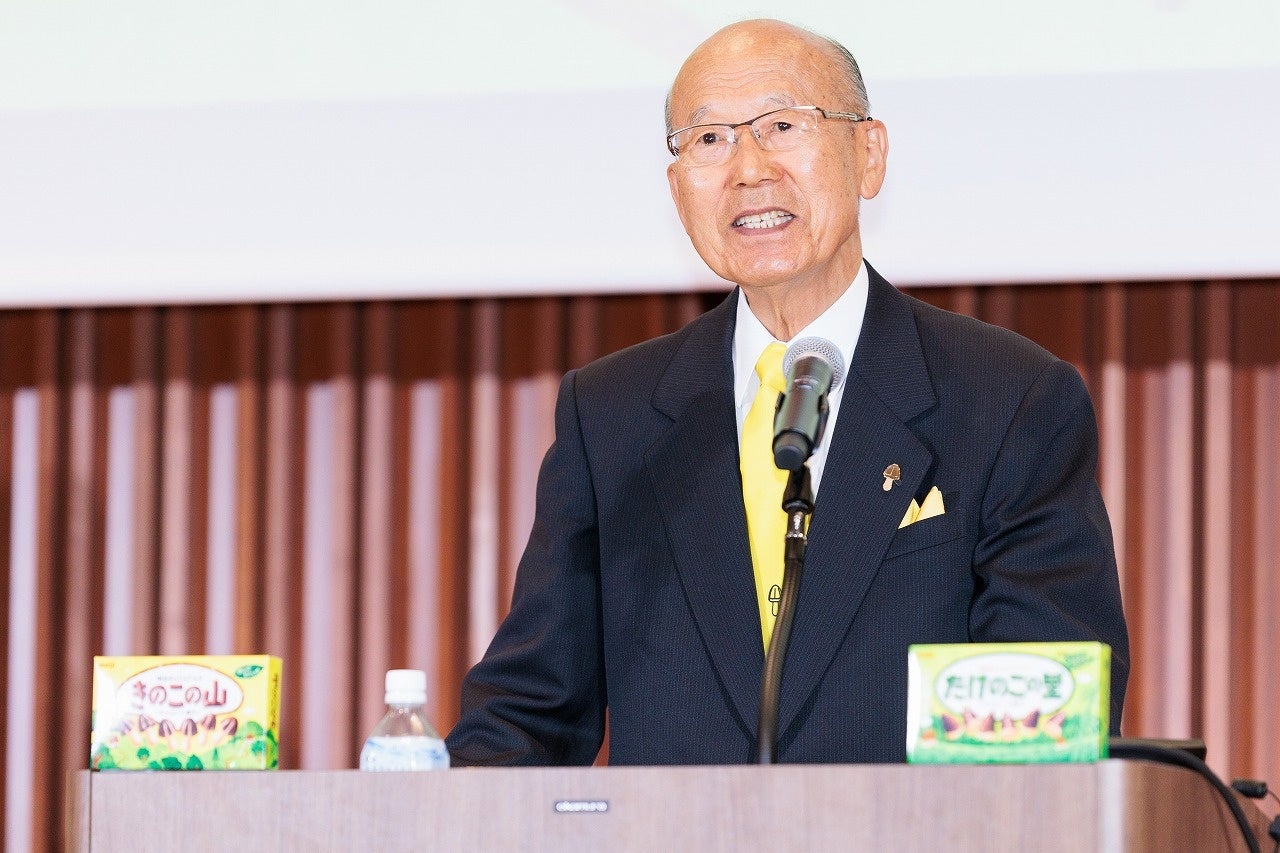 菓子にはロマンがあります。ほのぼのとして夢があります。理屈を超えた食文化の代表です。将来を生きる子供達の夢の食品です。子供達には夢、心を育むものです。菓子企業にはその責務があります。菓子は人間生活には理屈を超えた不可欠の食材です。菓子の事業にはその役割があり、菓子は夢そのものです。この「きのこの山」、「たけのこの里」がいつの世までも、そして世界に広く愛され続ける「いのち」の栄えを切に願っています。