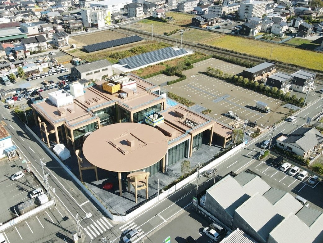 家族団らんの象徴でもあるダイニングテーブルや椅子、ショッピングバッグなどを実物の13倍にスケールアウトした建物には春華堂の本社機能の他、リブランドした「SHOP春華堂」と新業態のカフェ&ベーカリー「とらとふうせん」を開業。また南棟には浜松いわた信用金庫 森田支店とコミュニティスペース「meeting room ツノがたつ」を併設し、金融機関と協業しています。