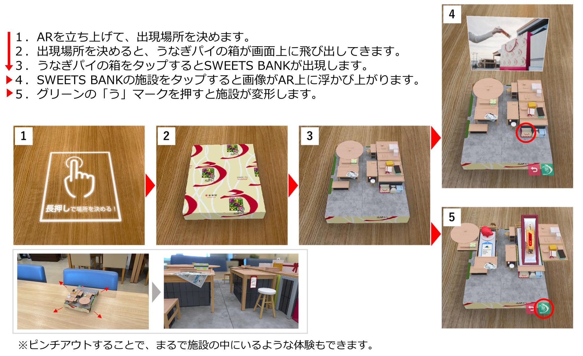 「SWEETS BANK」がAR画面上に飛び出し、周囲360°を閲覧体験できるサービスとなっています。