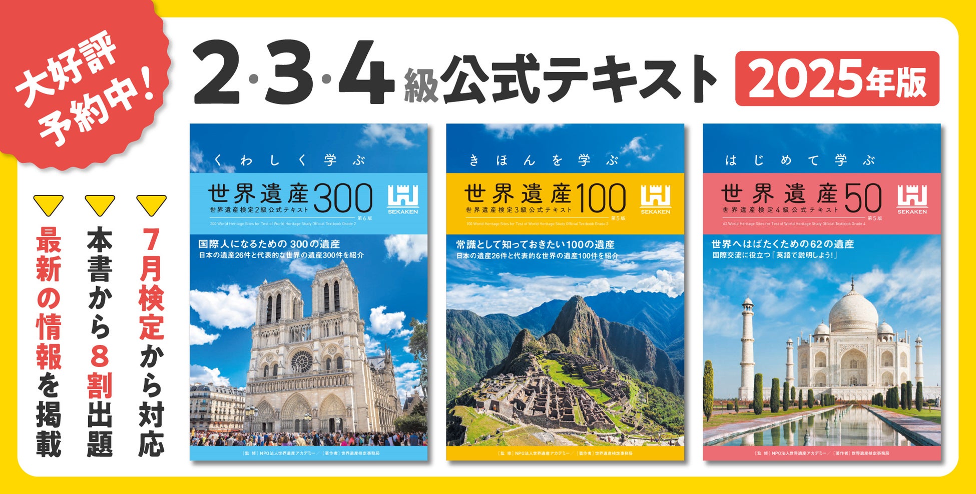 NPO法人世界遺産アカデミー/世界遺産検定事務局は、文部科学省後援「世界遺産検定」の2級・3級・4級公式テキストを2年ぶりに全面改訂します。2024年に世界遺産登録された「佐渡島(さど)の金山」ほか、世界遺産の最新情報を反映。各書の概要は別紙をご参照ください。発売日は2025年3月18日で、7月の第60回検定からは本書に準拠した出題内容となります。また、同日には2025年度版の公式過去問題集も発売します。2024年に新設された準1級の問題も完全収録。テキスト、過去問題集ともにオンラインで好評予約受付中です。