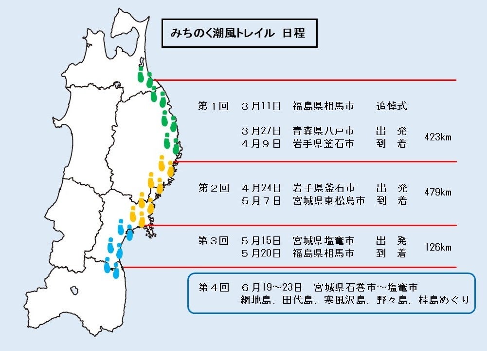 みちのく潮風トレイルは、青森県八戸市蕪島から福島県相馬市松川浦まで総延長1,000㎞を超える自然歩道です。環境省が整備し、2019年に全線が開通しました。垣添会長は2023年3月27日から6月下旬にかけて、みちのく潮風トレイルを4回に分けて北から南へ歩く予定です。