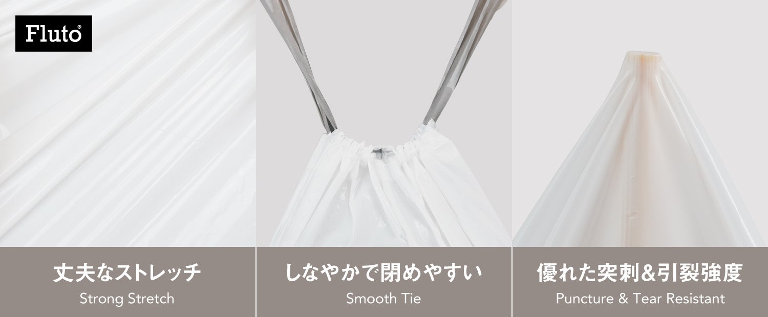 さらに口元は、幅2.7cmの紐をキュッと引くだけで閉じられる巾着仕様にし、結ぶ手間を減らして手も汚れにくい。袋は厚手のLDPEのつるつるフィルムで、紐の引き出しがスムーズで、ストレッチ性があり、重いごみや角のあるごみでも破れにくく裂けにくいのが特長です。袋を結ばない分、容量いっぱいまで入れやすく、耐水性で水漏れも防ぎます。また、中身が透けにくい乳白色でプライバシーを守り、日々の使い心地の良さを目指しました。