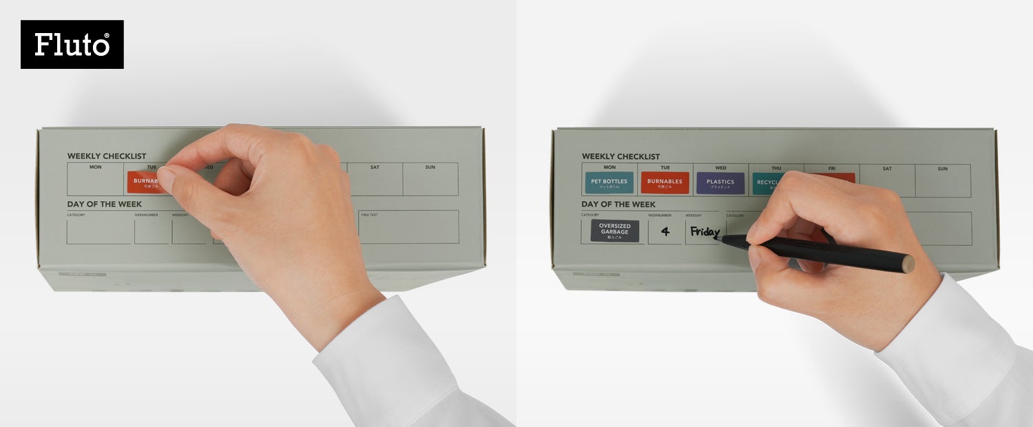 そこでFlutoは、ごみ出しの出し忘れ対策に特化した、「Fluto紐付きゴミ袋 分別カレンダー付き」(※意匠登録出願中)を新発売します。パッケージの週間スケジュール表と付属の記入用シールで、家庭ごとの回収ルールを見える形に整理。ごみ袋のそばで予定を確認でき、出し忘れを防ぐ仕組みを提供します。