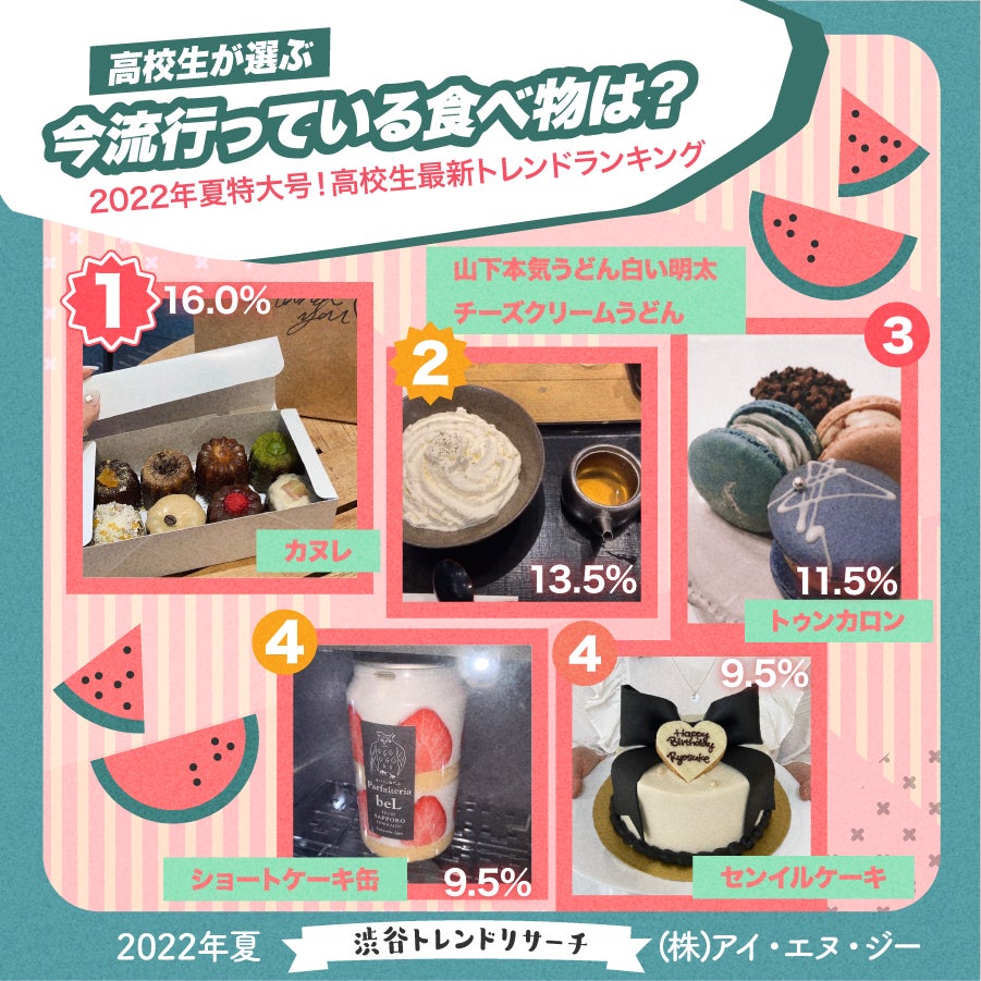 春の同調査では6位だった「カヌレ」が1位にランクアップ。平成レトロブームの影響から人気が急上昇している様子が、覗えます。2位は、「山下本気うどん 白い明太チーズクリームうどん」。ビジュアルにインパクトがあることからも、映えを求める高校生の間で流行しています。続いて3位は、韓国発祥の進化系マカロンの「トゥンカロン」がランクイン。通常のマカロンに比べてサイズも厚みもボリューミーで、可愛いだけでなくお腹も満足出来るトレンドスイーツです。