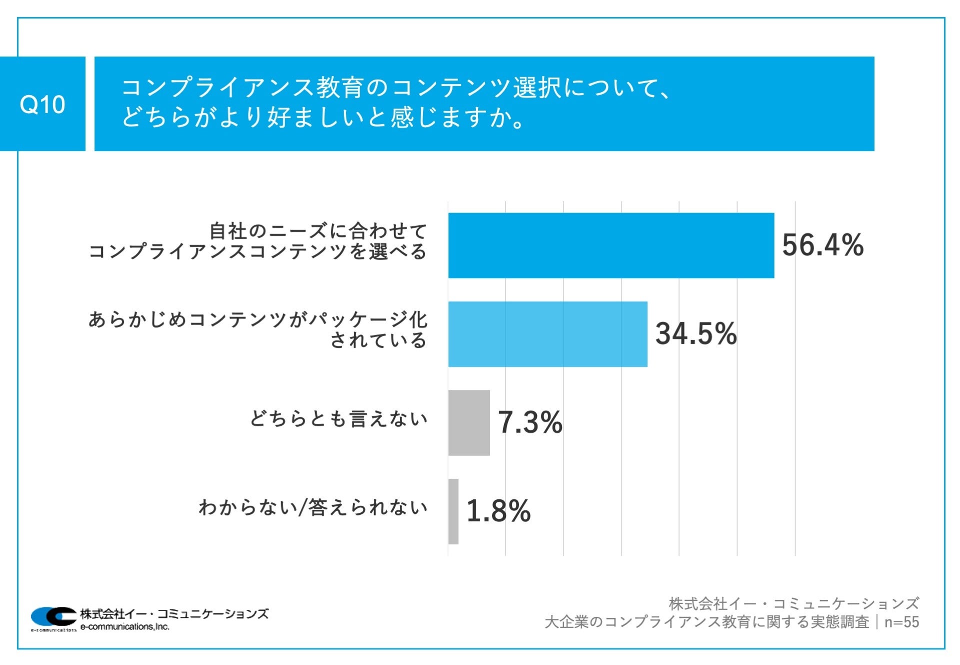 Q9で「eラーニング」と回答した方に、「Q10.コンプライアンス教育のコンテンツ選択について、どちらがより好ましいと感じますか。」(n=55)と質問したところ、「自社のニーズに合わせてコンプライアンスコンテンツを選べる」が56.4%、「あらかじめコンテンツがパッケージ化されている」が34.5%という回答となりました。