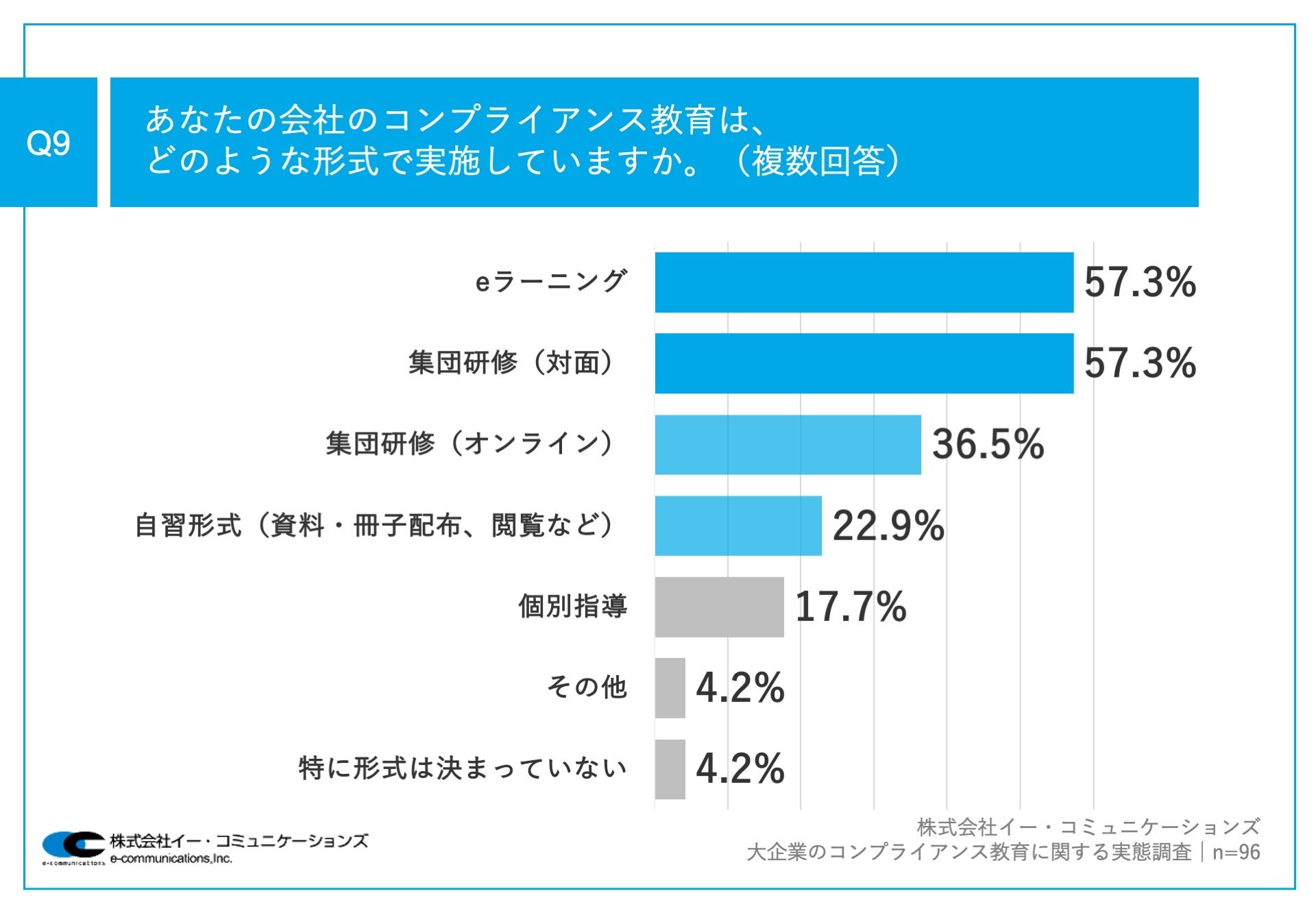 Q1で「はい」と回答した方に、「Q9.あなたの会社のコンプライアンス教育は、どのような形式で実施していますか。(複数回答)」(n=96)と質問したところ、「eラーニング」が57.3%、「集団研修(対面)」が57.3%、「集団研修(オンライン)」が36.5%という回答となりました。