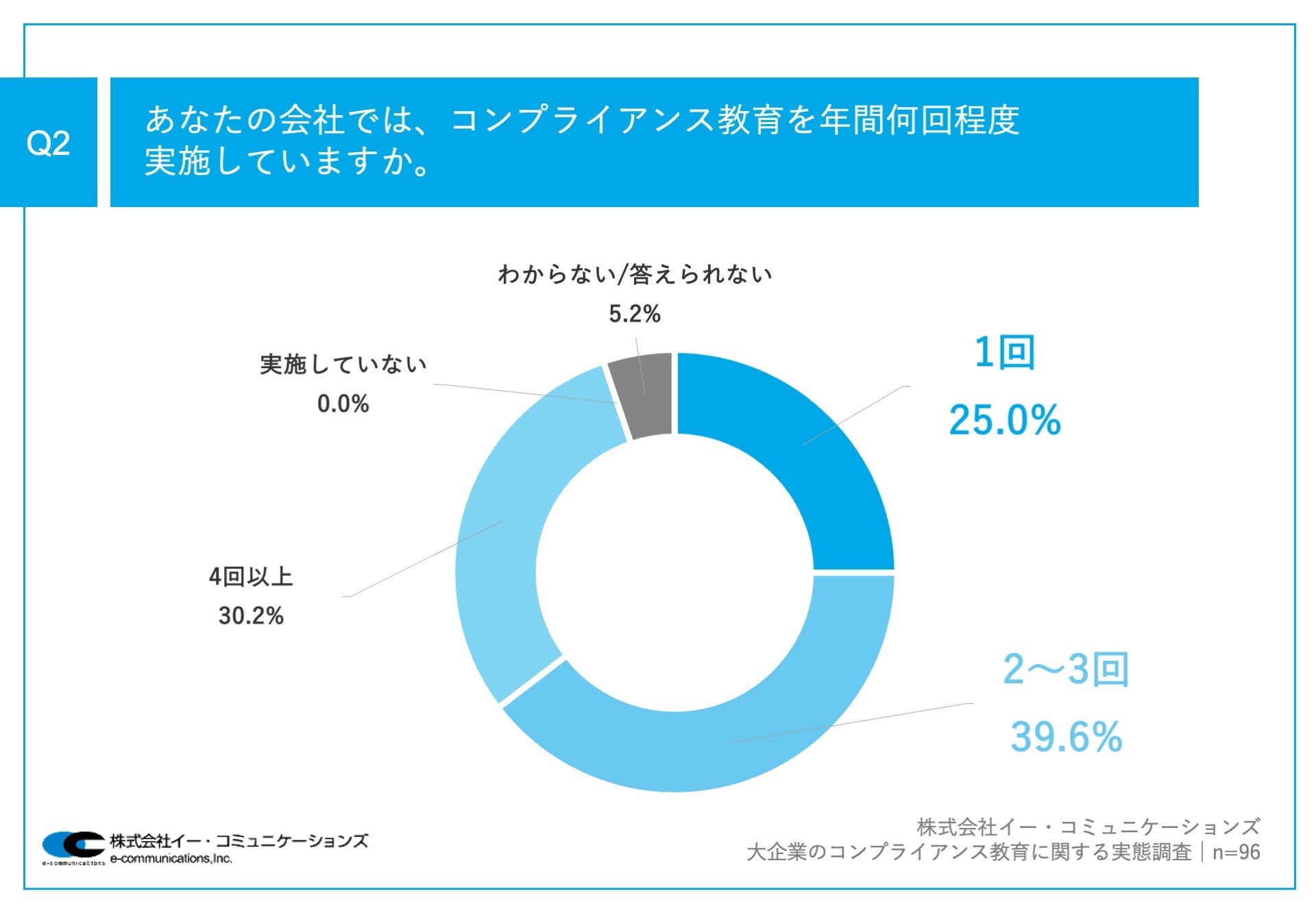 Q1で「はい」と回答した方に、「Q2.あなたの会社では、コンプライアンス教育を年間何回程度実施していますか。」(n=96)と質問したところ、「1回」が25.0%、「2〜3回」が39.6%、「4回以上」が30.2%という回答となりました。