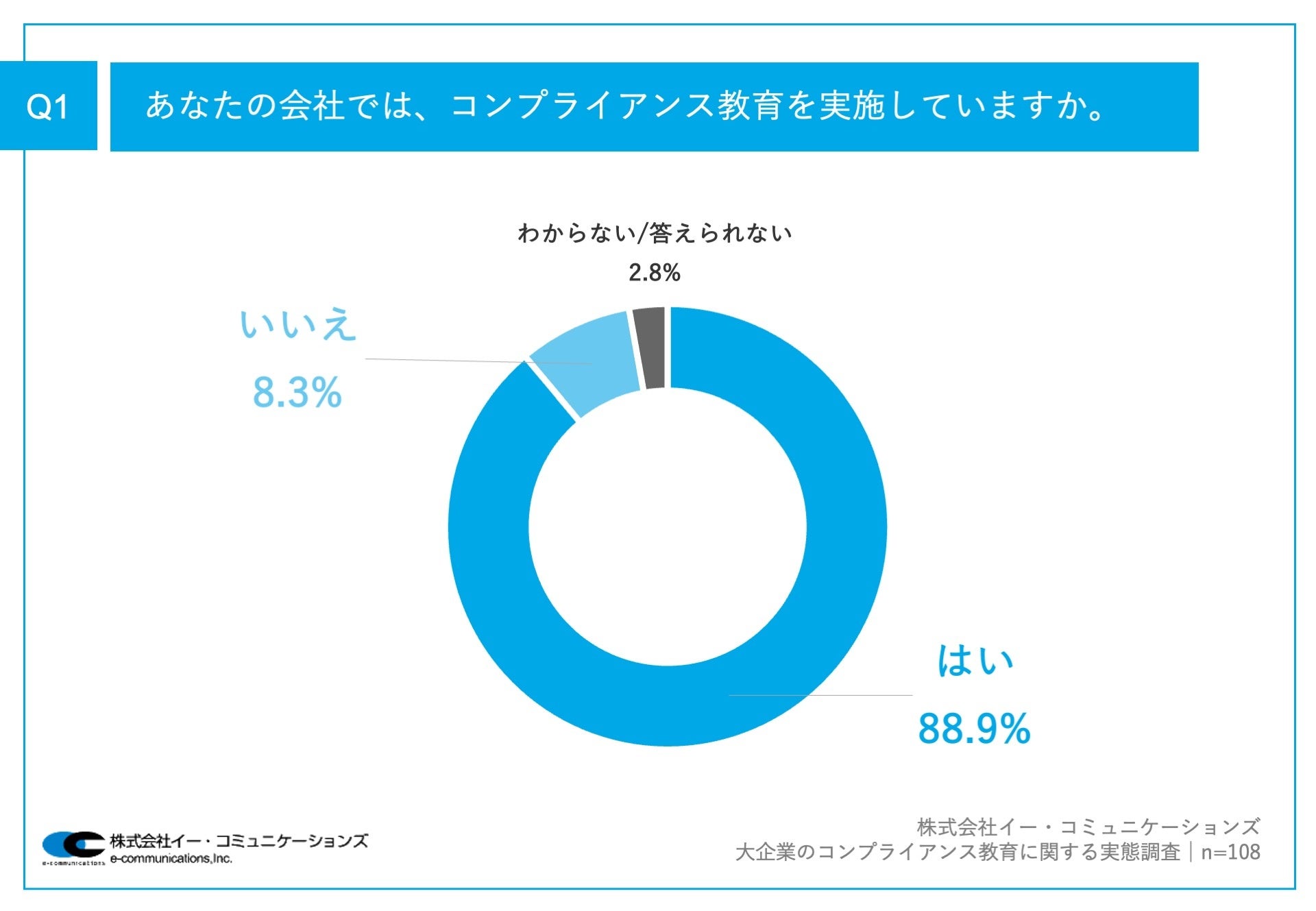 「Q1.あなたの会社では、コンプライアンス教育を実施していますか。」(n=108)と質問したところ、「はい」が88.9%、「いいえ」が8.3%という回答となりました。