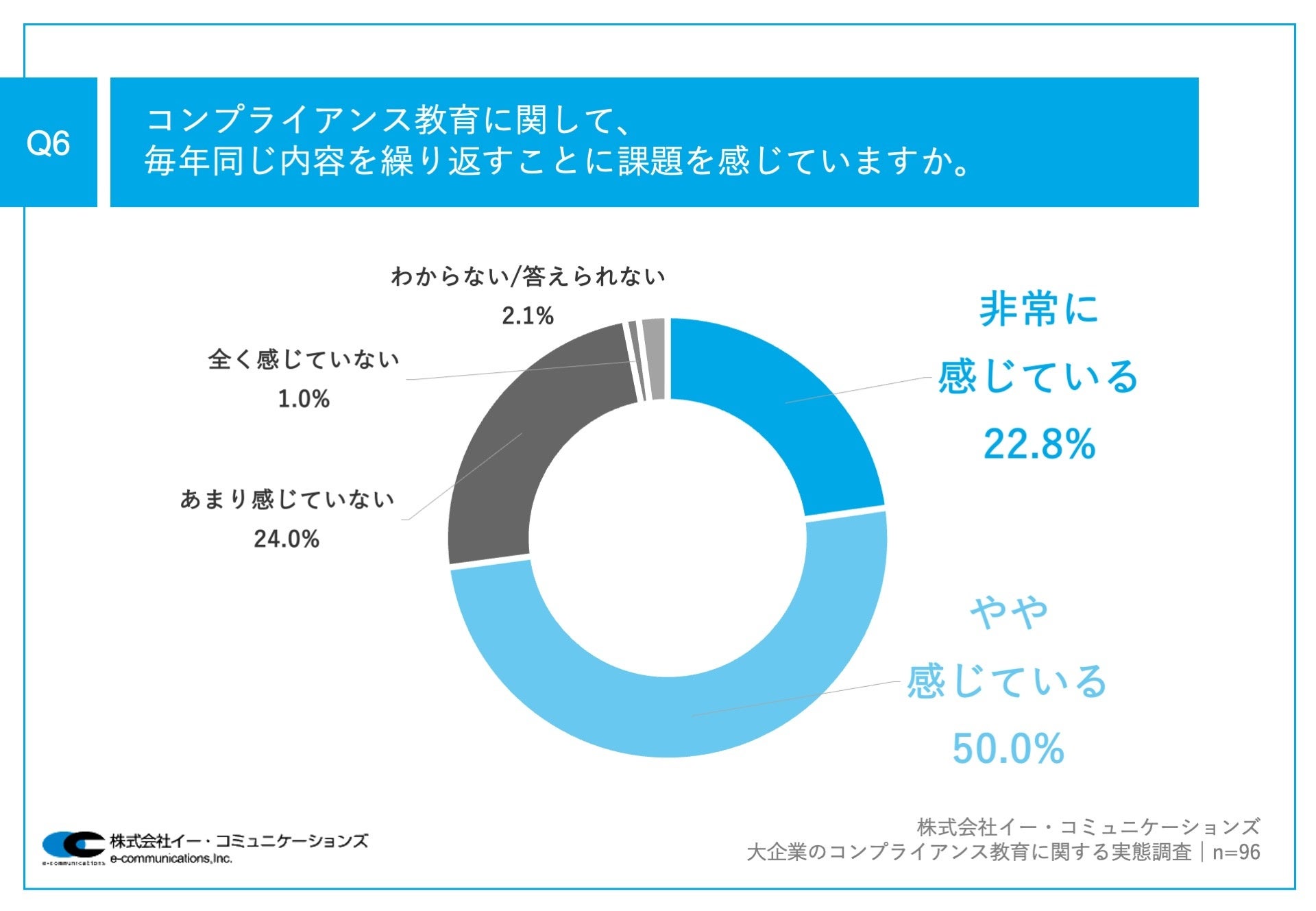 Q1で「はい」と回答した方に、「Q6.コンプライアンス教育に関して、毎年同じ内容を繰り返すことに課題を感じていますか。」(n=96)と質問したところ、「非常に感じている」が22.8%、「やや感じている」が50.0%という回答となりました。