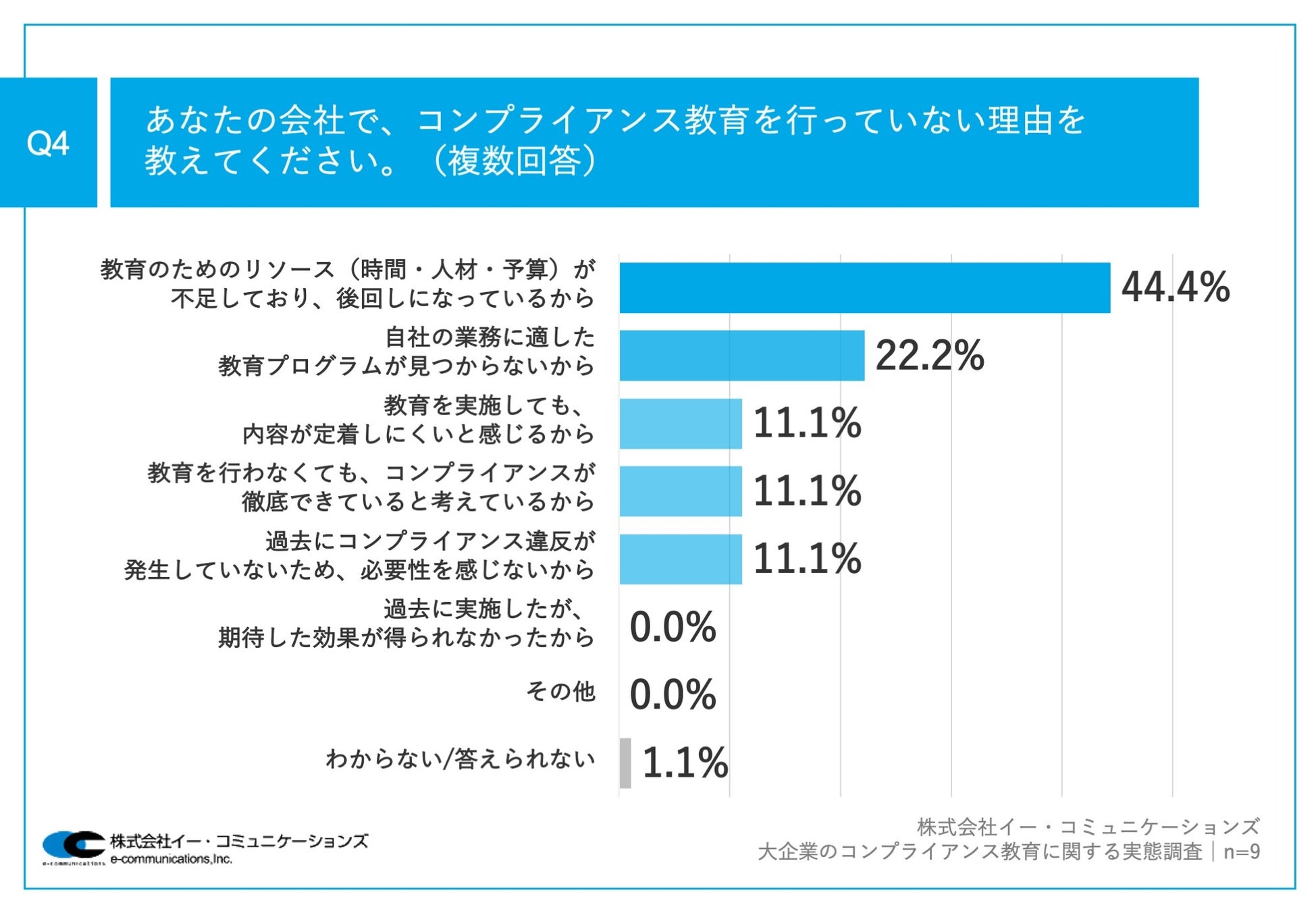 Q1で「いいえ」と回答した方に、「Q4.あなたの会社で、コンプライアンス教育を行っていない理由を教えてください。(複数回答)」(n=9)と質問したところ、「教育のためのリソース(時間・人材・予算)が不足しており、後回しになっているから」が44.4%、「自社の業務に適した教育プログラムが見つからないから」が22.2%という回答となりました。