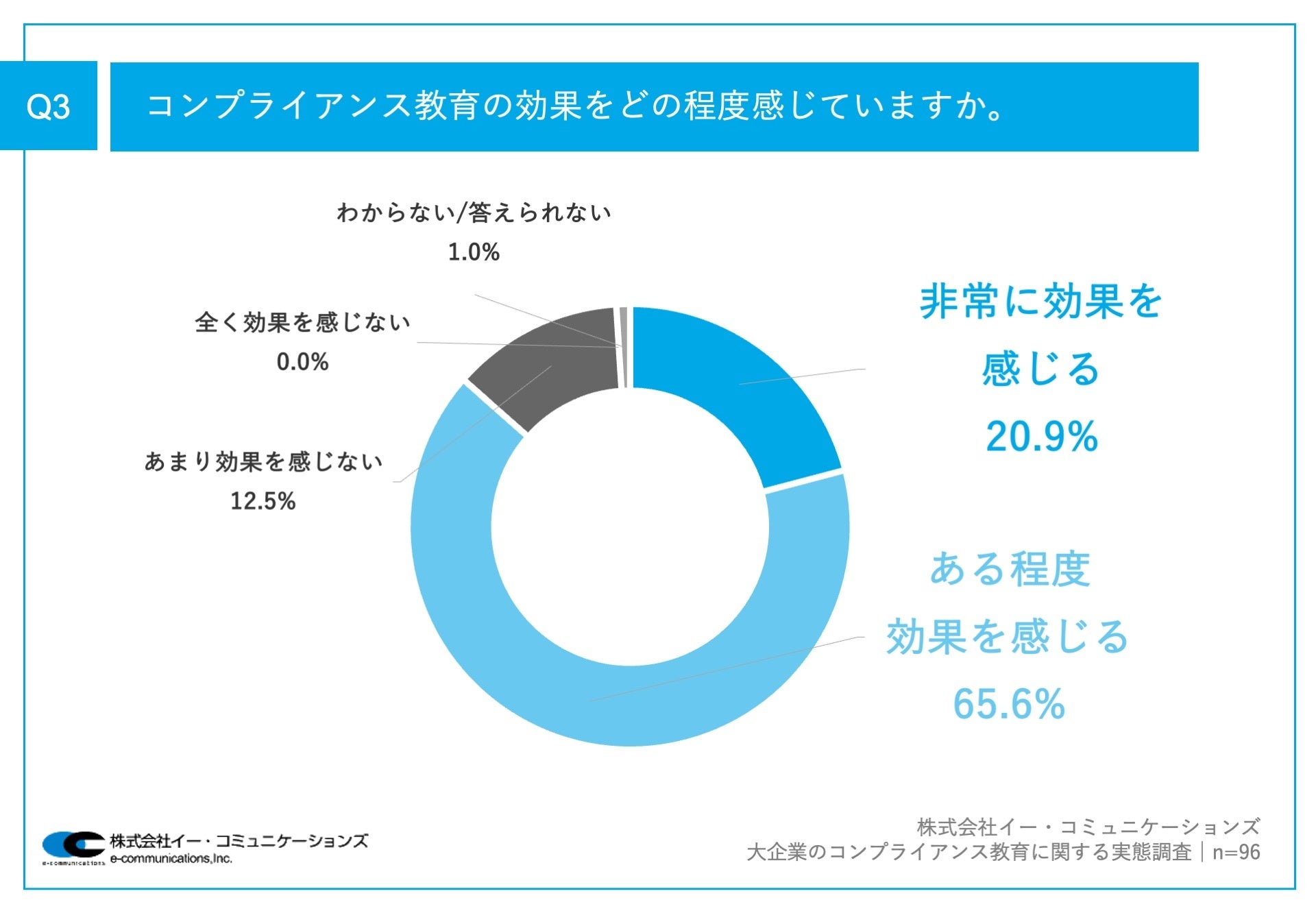 Q1で「はい」と回答した方に、「Q3.コンプライアンス教育の効果をどの程度感じていますか。」(n=96)と質問したところ、「非常に効果を感じる」が20.9%、「ある程度効果を感じる」が65.6%という回答となりました。