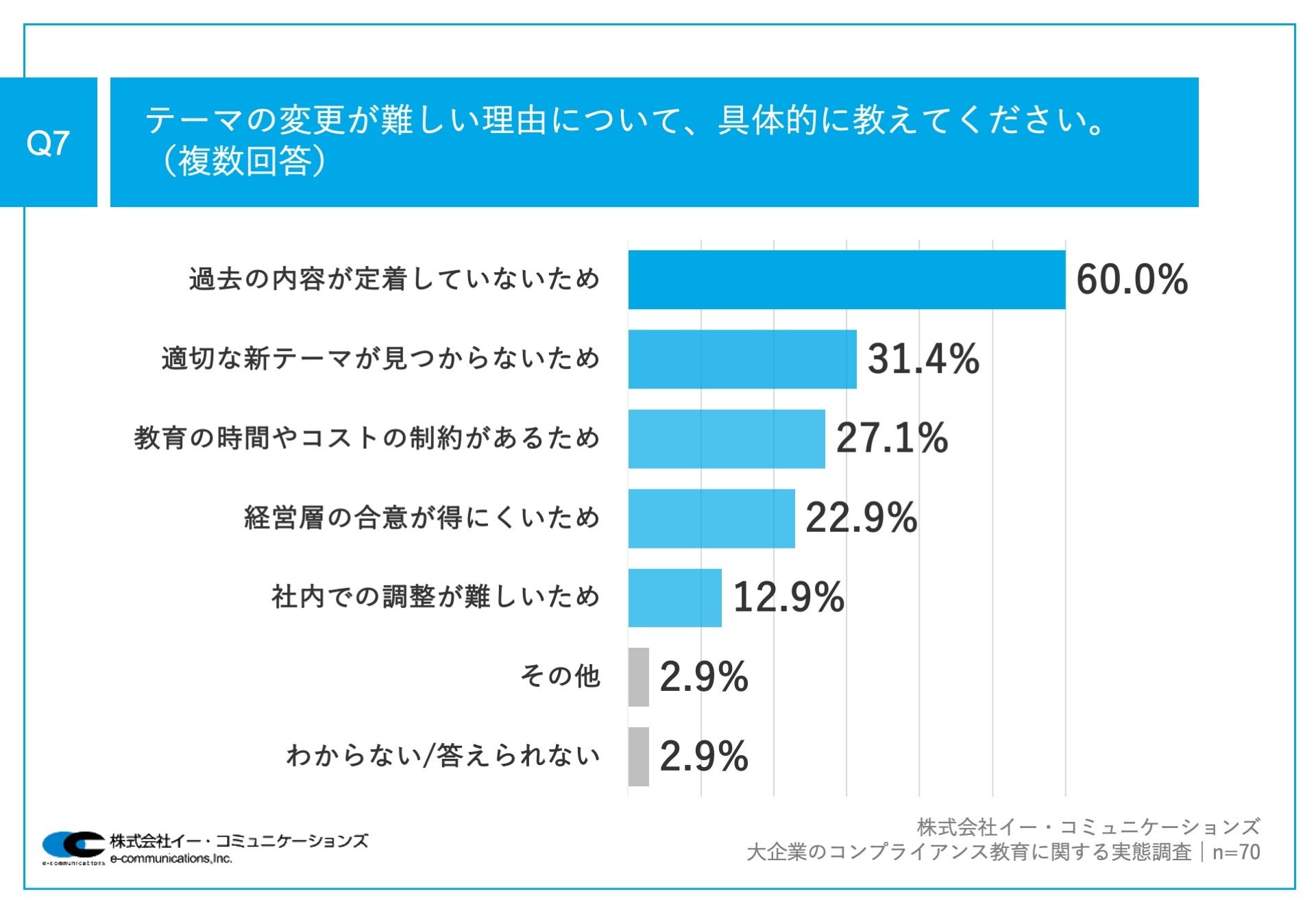 Q6で「非常に感じている」「やや感じている」と回答した方に、「Q7.テーマの変更が難しい理由について、具体的に教えてください。(複数回答)」(n=70)と質問したところ、「過去の内容が定着していないため」が60.0%、「適切な新テーマが見つからないため」が31.4%、「教育の時間やコストの制約があるため」が27.1%という回答となりました。