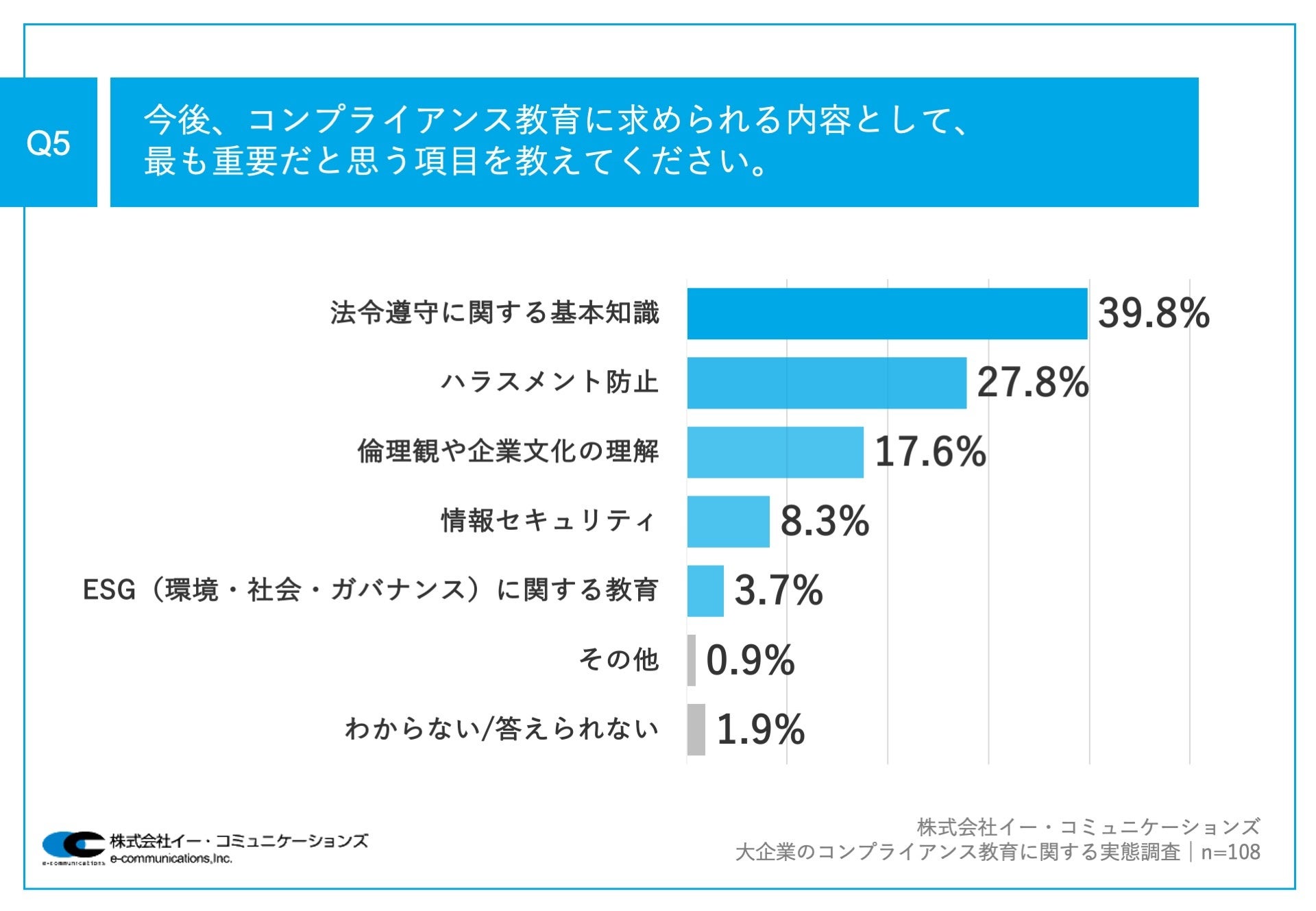 「Q5.今後、コンプライアンス教育に求められる内容として、最も重要だと思う項目を教えてください。」(n=108)と質問したところ、「法令遵守に関する基本知識」が39.8%、「ハラスメント防止」が27.8%、「倫理観や企業文化の理解」が17.6%という回答となりました。