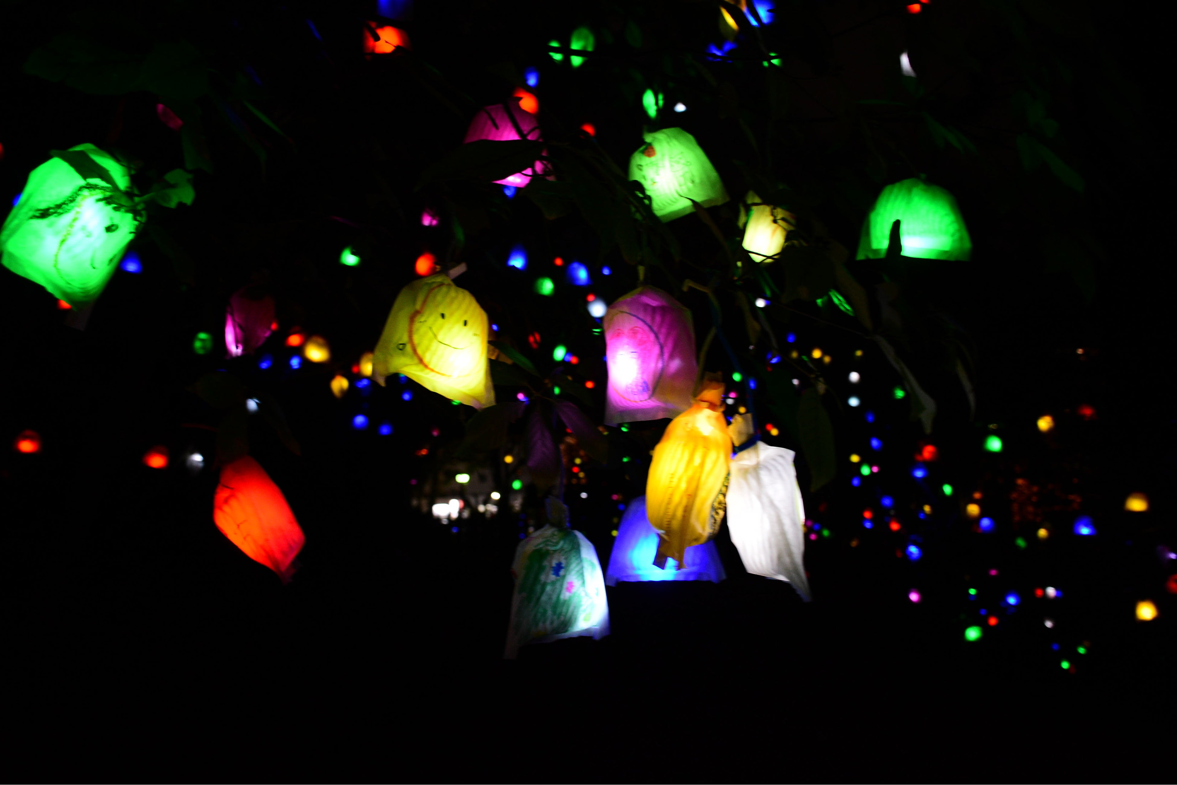 「人々に笑顔を」という思いから始まった、アーティスト髙橋匡太さんの作品。観光客・市民参加型の作品で、果実袋に大切な人の笑顔を描いて、LEDで色とりどりに光る実を飾ります。