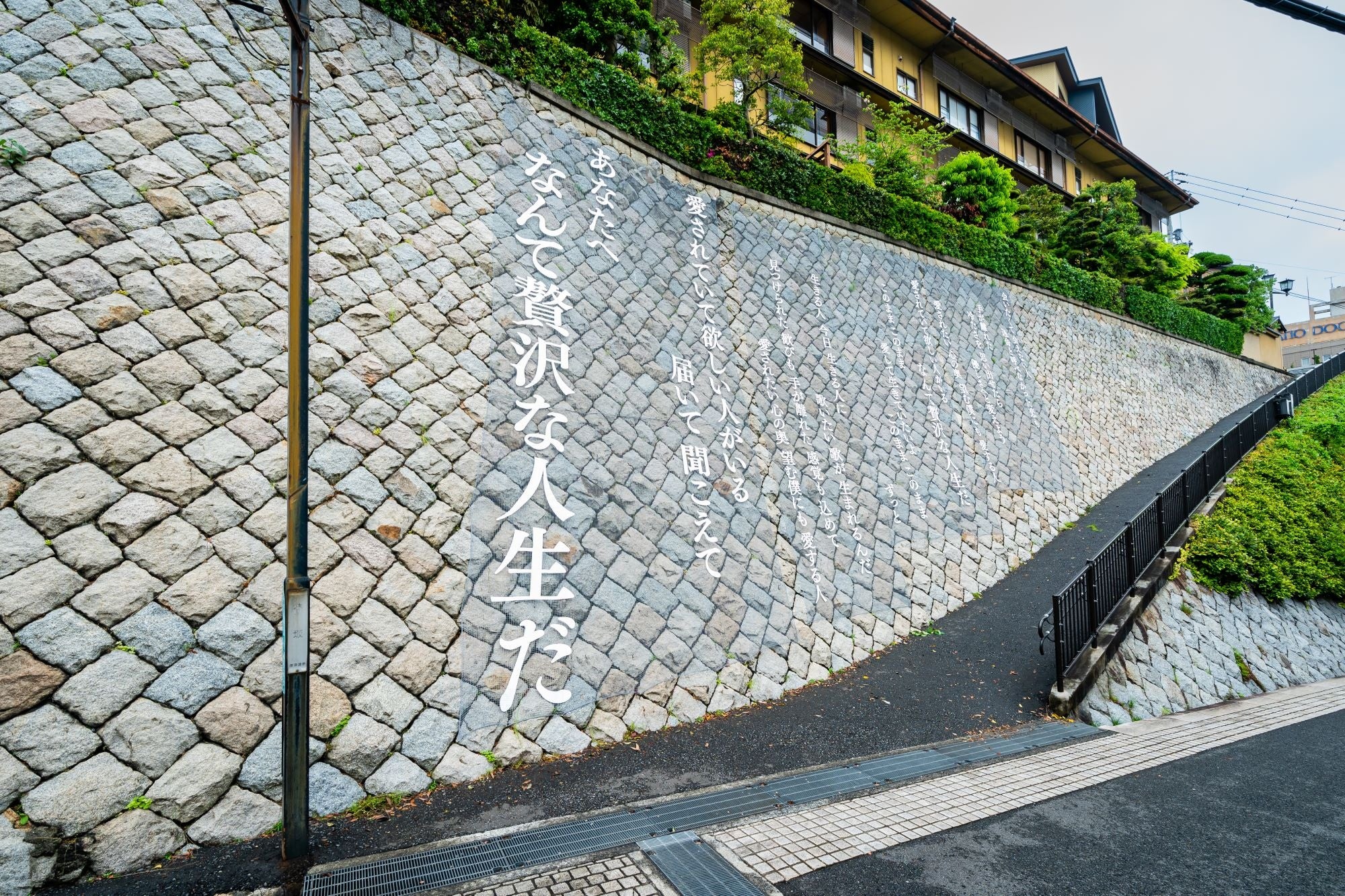 道後のまちを1冊の詩集に見立て、夏井いつきさんやSUPER BEAVERをはじめとするアーティストやクリエーターなどが、思いを込めて選んだ言葉を路地裏や坂道、駐車場、建物の壁面などに表現。