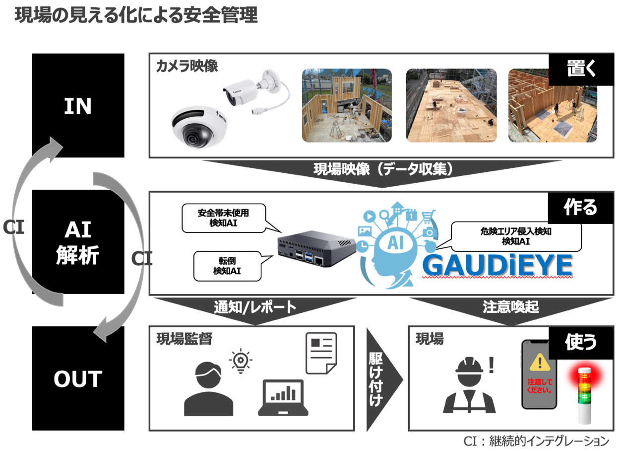 2022年4月に正式販売を開始したGAUDiEYEは、独自AIが簡単に搭載でき、高精度のAI・メンテナンス性の高いIoT管理システム(GAUDiHUB)がありながら、AIカメラを低価格で提供するという製品が幅広い支持を集め、年内予測含む出荷台数が500台に達しています。製造・建設・介護など現場の安心・安全に貢献し、万が一の労災の予防・発生時の記録が残るAI機能搭載カメラです。