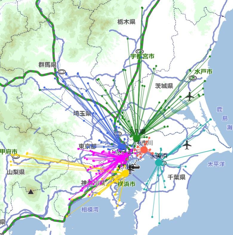 ・物流拠点と配送先(顧客)をラインで結び配送状況を見える化、コストや配送網の無駄を分析