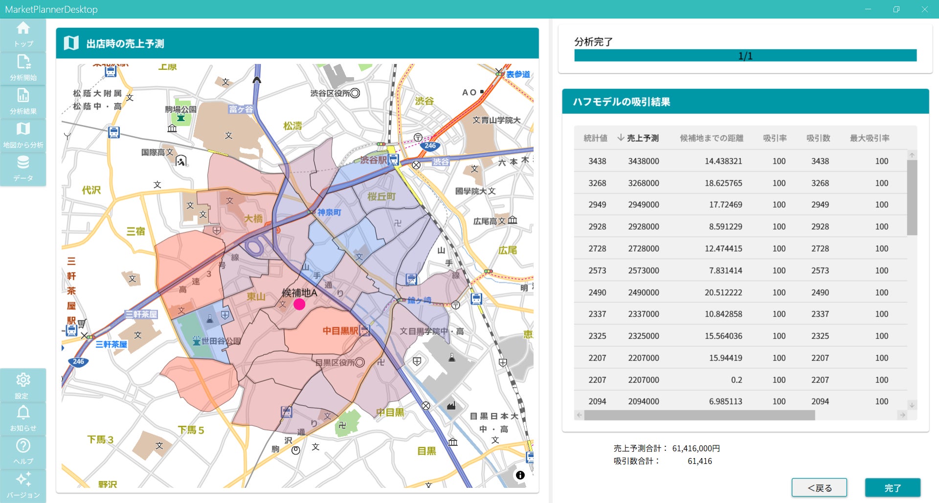 ・競合店舗を加味した店舗吸引率(来店確率)を分析し、売上げ予測を算出