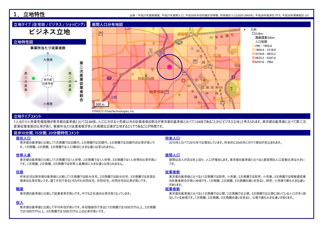 ・拠点周辺の人口や世帯数などをグラフ表示した、エリアの特性レポートを作成