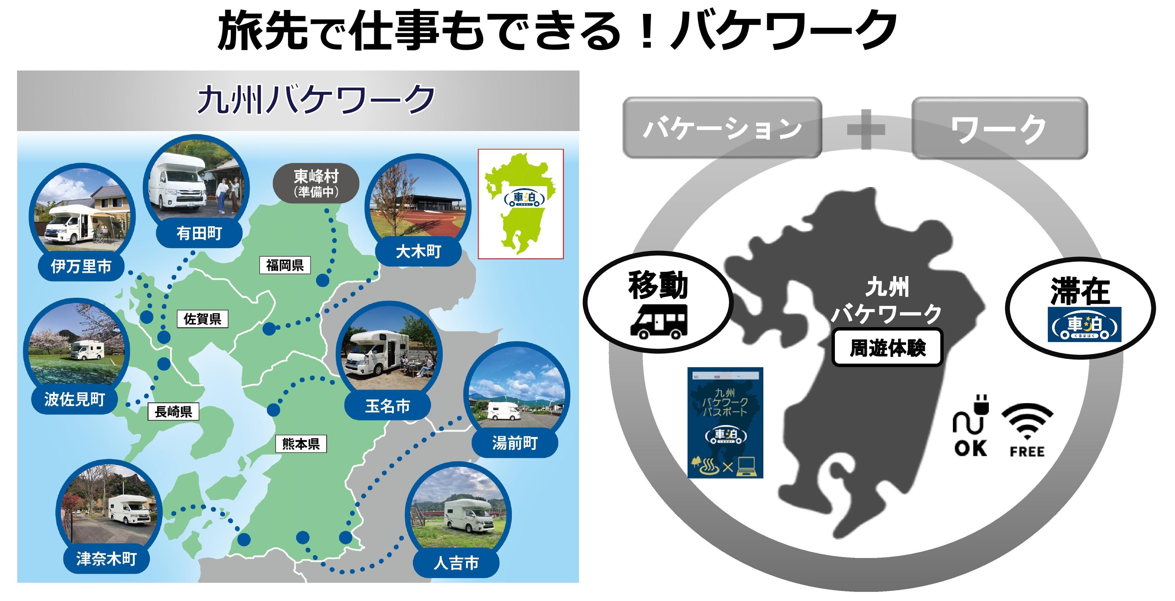 コロナ禍の休暇(バケーション)中に密のない自然豊かな地域、隠れた観光スポットなどを巡る周遊客に対し、車泊(くるまはく)による地域滞在と、プライベートな車内空間で仕事(テレワーク、オンライン会議など)も行える環境を提供する周遊型観光・ワーケーション『九州バケワーク』の有料モニターを募集しています。