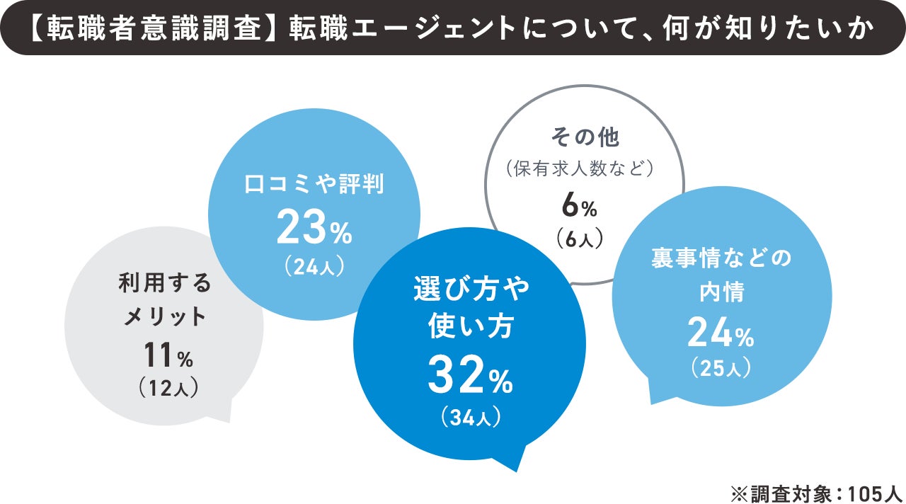 「(転職エージェントの)選び方や使い方について」が32%と最も多く、次に「裏事情などの内情」(24%)、「口コミや評判」(23%)などがランクインしました。