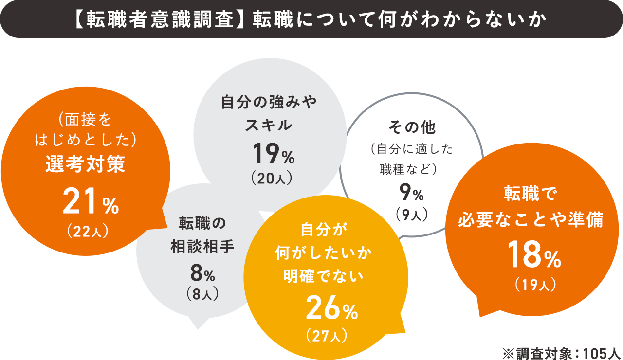 転職についての疑問を調査した結果、「自分が何がしたいか明確でない」という回答が最も多く26%、「選考対策に関する疑問」が21%という結果が明らかになりました。