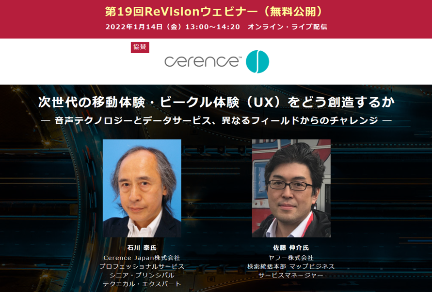 【無料WEBセミナー】 Cerence、ヤフーから講師を迎え、次世代の移動体験・ビークル体験(UX)に関する講演・議論を無料ライブ配信 ― 2022年1月14日(金)