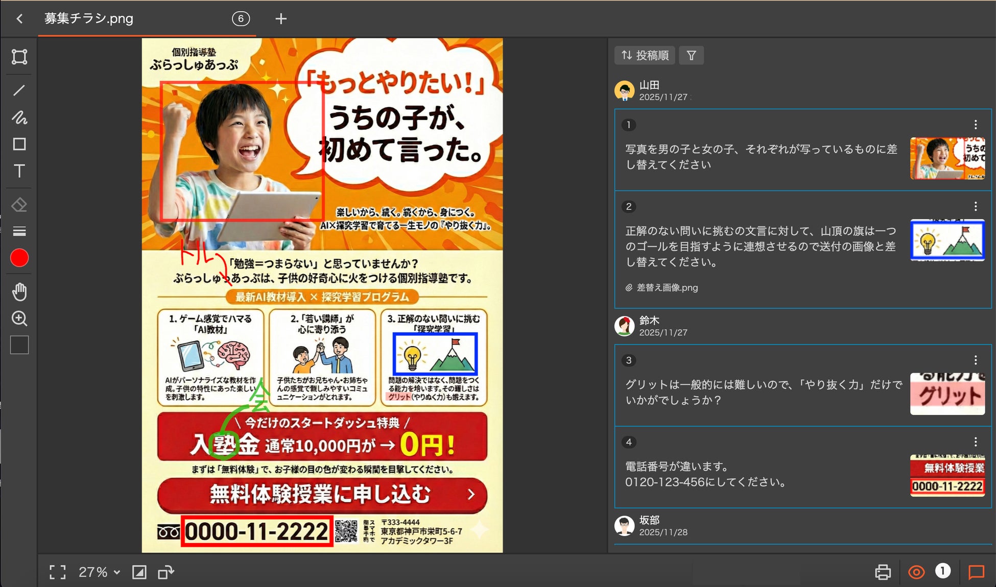 オンラインで制作物のファイル共有・プレビュー・校正指示・検版が可能。最新データが一目で把握でき、修正履歴の確認も行えるため、ミス・ロスを削減。 |