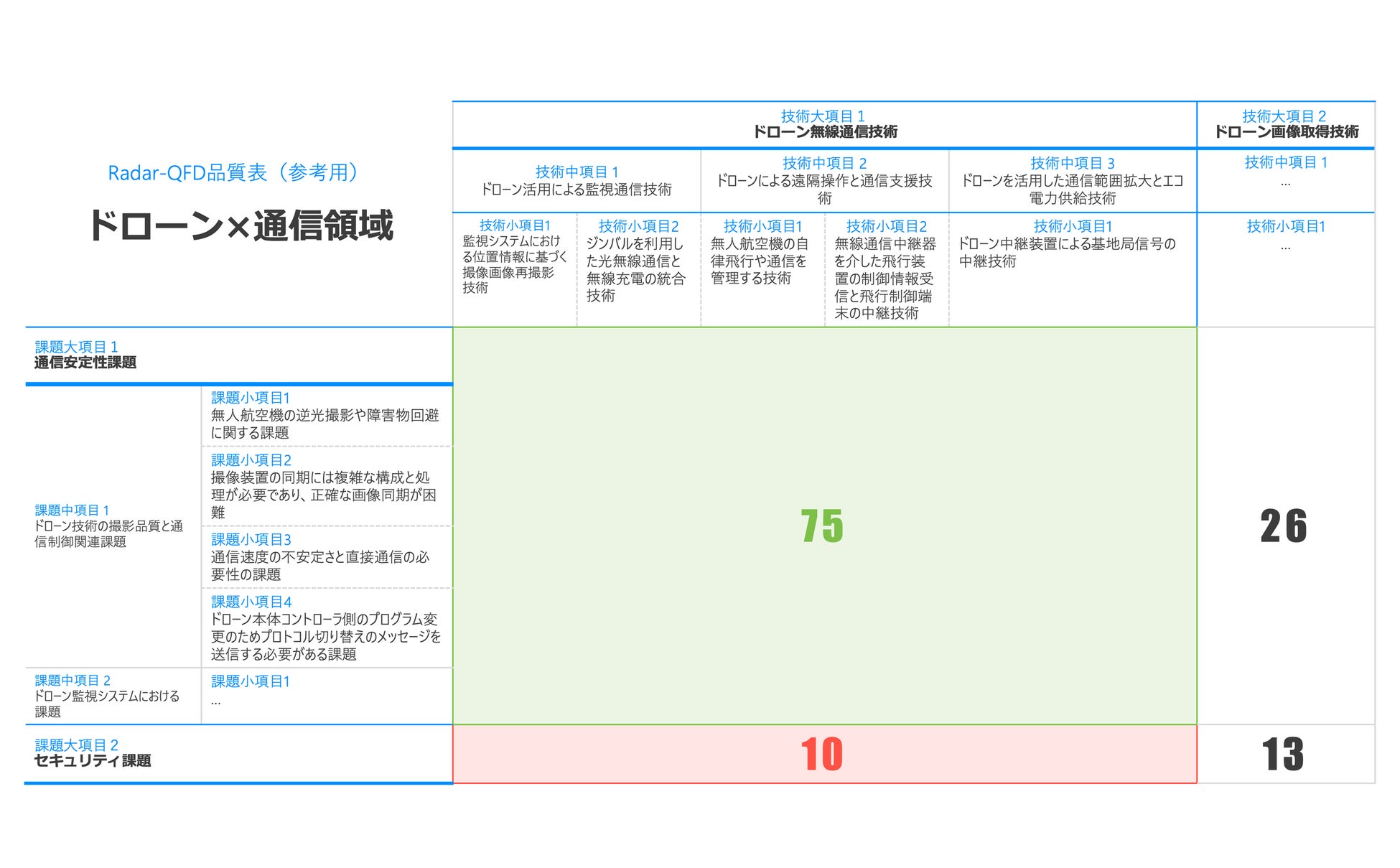 「Radar QFD」は、単なるデータ分析ツールではなく、開発現場でそのまま活用できる実用的な情報を提供します。AIが生成した情報は、分かりやすい構造化データとして整理されており、技術ロードマップ策定や事業戦略立案にも応用可能です。