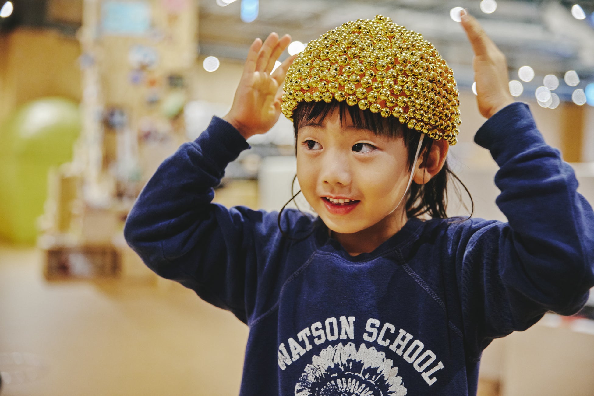 大仏さまの螺髪(らほつ)のような見た目の、たくさんの鈴がついた帽子。 飛んだり回ったり、頭を左右に振ってみたりすると、シャラシャラ音がします。 かぶっていると頭や耳が音で包まれる感覚に。