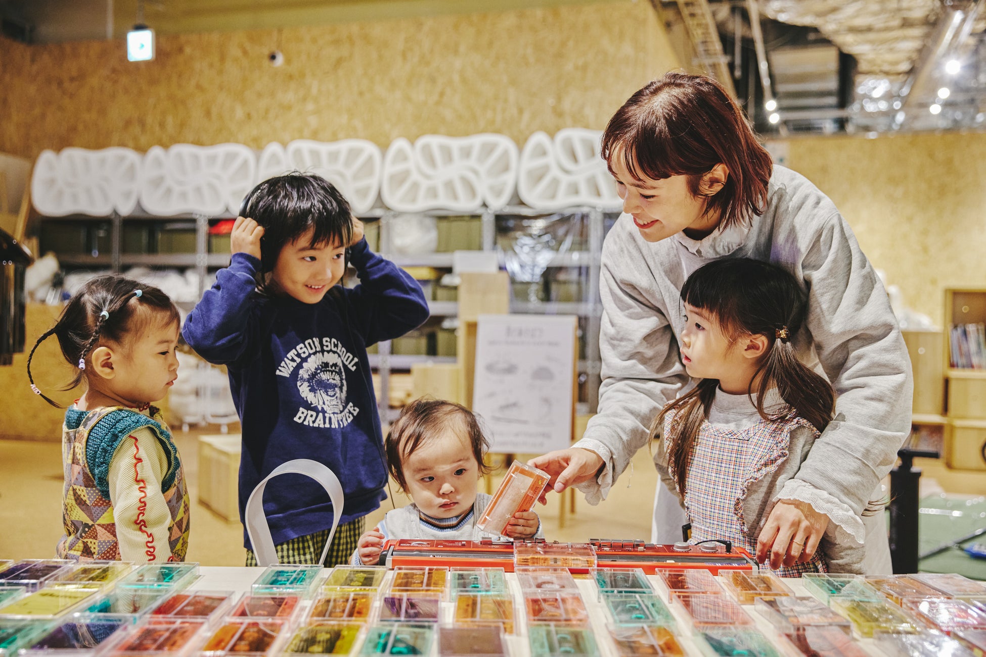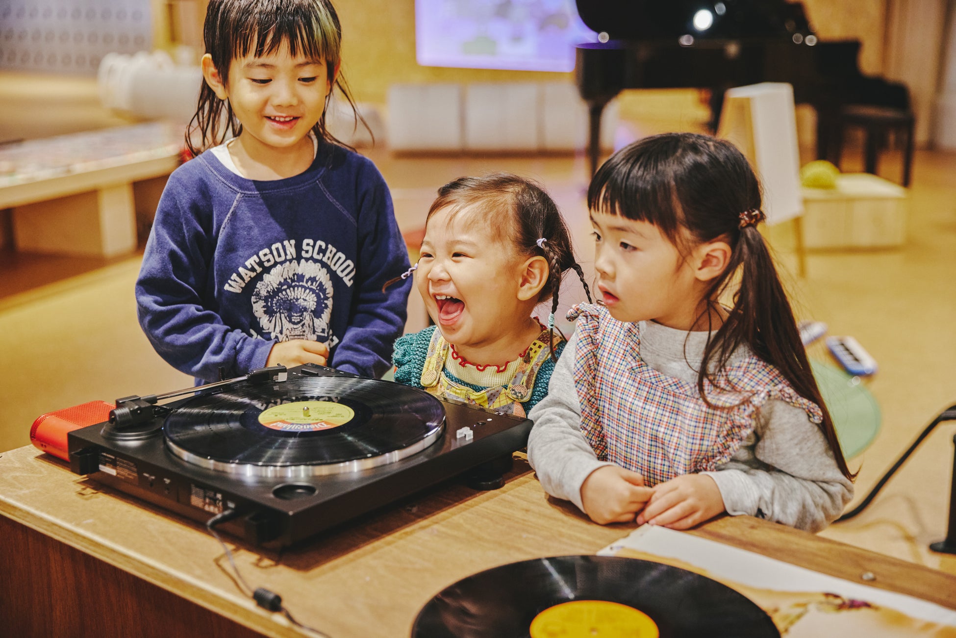 日替わりのワークショップ開始前にレコードから音楽が流れます。 デジタル音源になじんだ子どもたちにはなかなか親しみのないレコードですが、レコード盤に針を落としたり、レコードが回る様子を視覚的にも楽しんだりといったアナログな体験ができます。