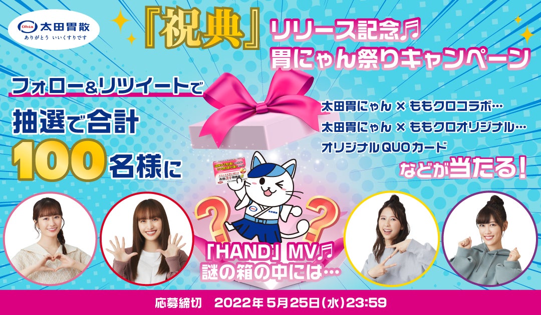 株式会社 太田胃散(本社:東京都文京区/代表取締役社長: 太田淳之)は、太田漢方胃腸薬Ⅱのタイアップソング「HAND」が収録されたアルバム『祝典』のリリースを記念して、「『祝典』リリース記念♬胃にゃん祭りキャンペーン」として、太田胃にゃん×ももクロのオリジナルコラボグッズなどの豪華プレゼントが100名に当たるキャンペーンを5/17(火) キャンペーンツイート投稿時~5/25(水) 23: 59の期間で実施します。
