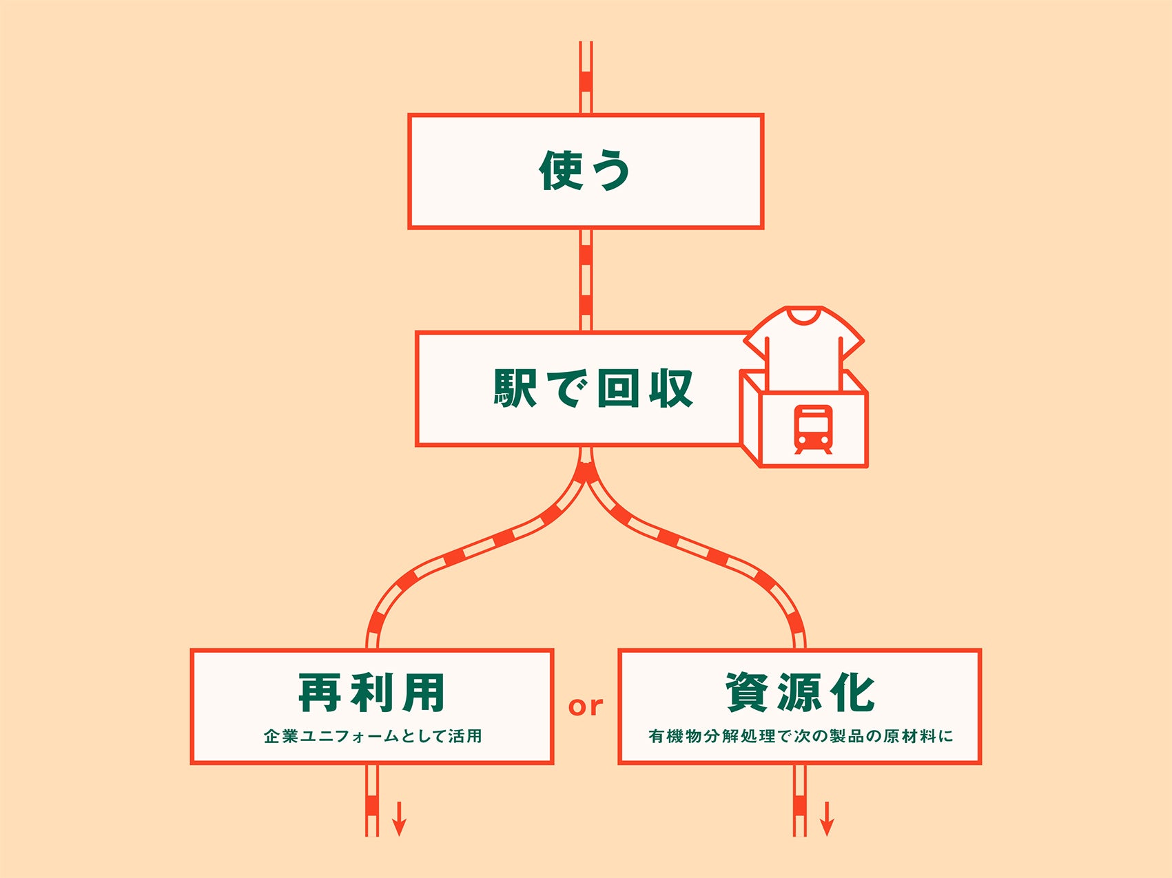 「MAWASU STATION」は、着られなくなった衣服を再利用や資源化によって、再び必要とされるものに生まれ変わらせる循環の仕組みです。今回は、JR中央線、JR南武線の駅及びJRCCDの駅ビルを回収拠点として、利用者の皆さまの不要になった衣服を回収し、メンテナンスや抗菌加工を行い、企業ユニフォームなどへの再利用を行います。また、再利用が難しい衣服は、有機物分解処理によって、次の製品の原材料として資源化し再生利用します。
