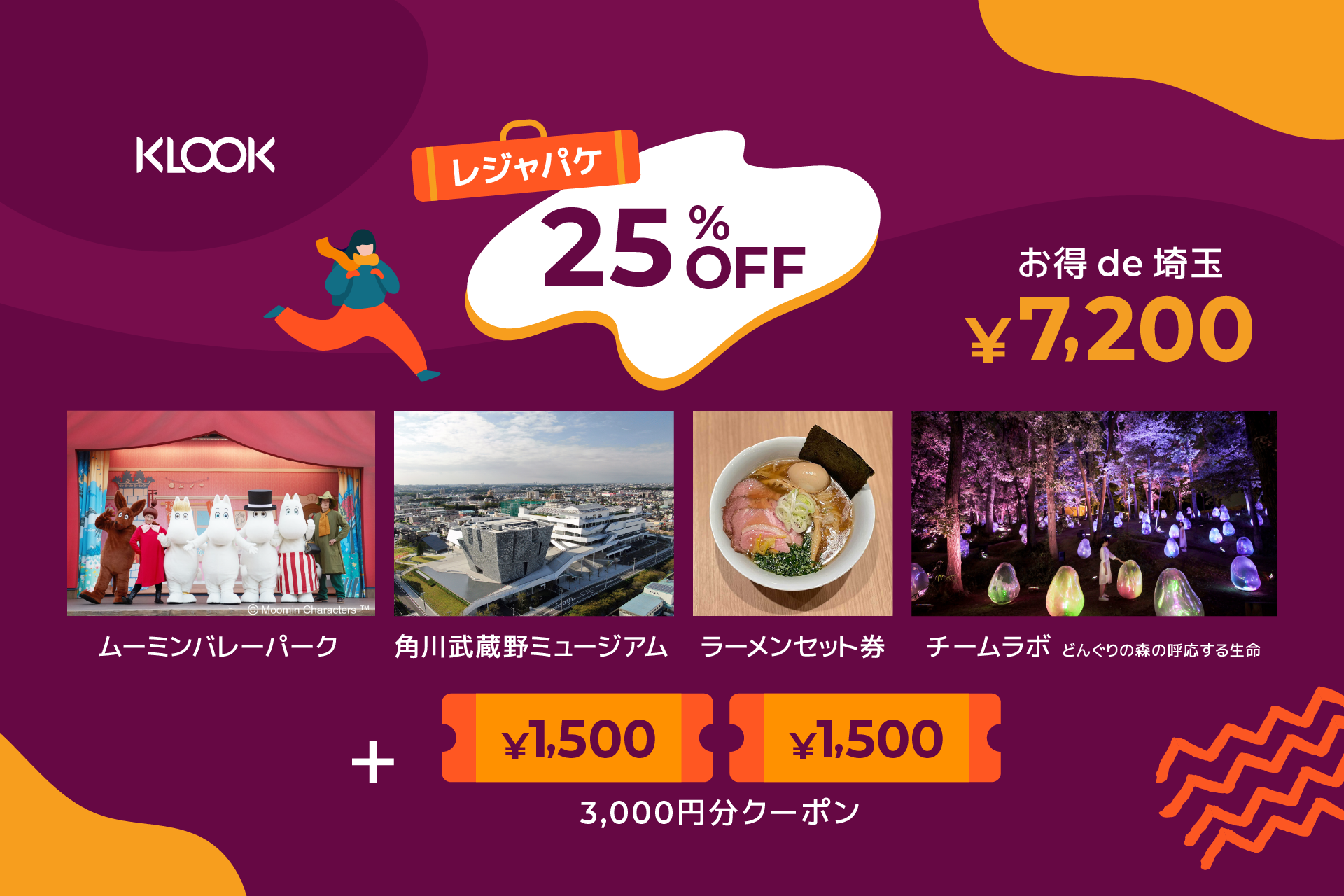 ①ムーミンバレーパーク+②角川武蔵野ミュージアム+③チームラボ どんぐりの森の呼応する生命+④ラーメンWalkerキッチンのラーメンセット券+④Klookクーポン3,000円分=計9,600円が7,200円(2,400円割引)