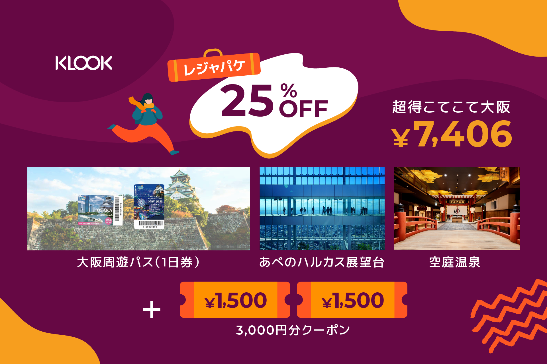 ①大阪周遊パス(1日券)+②空庭温泉+③あべのハルカス展望台+④Klookクーポン3,000円分=計9,874円が7,406円(2,468円割引)