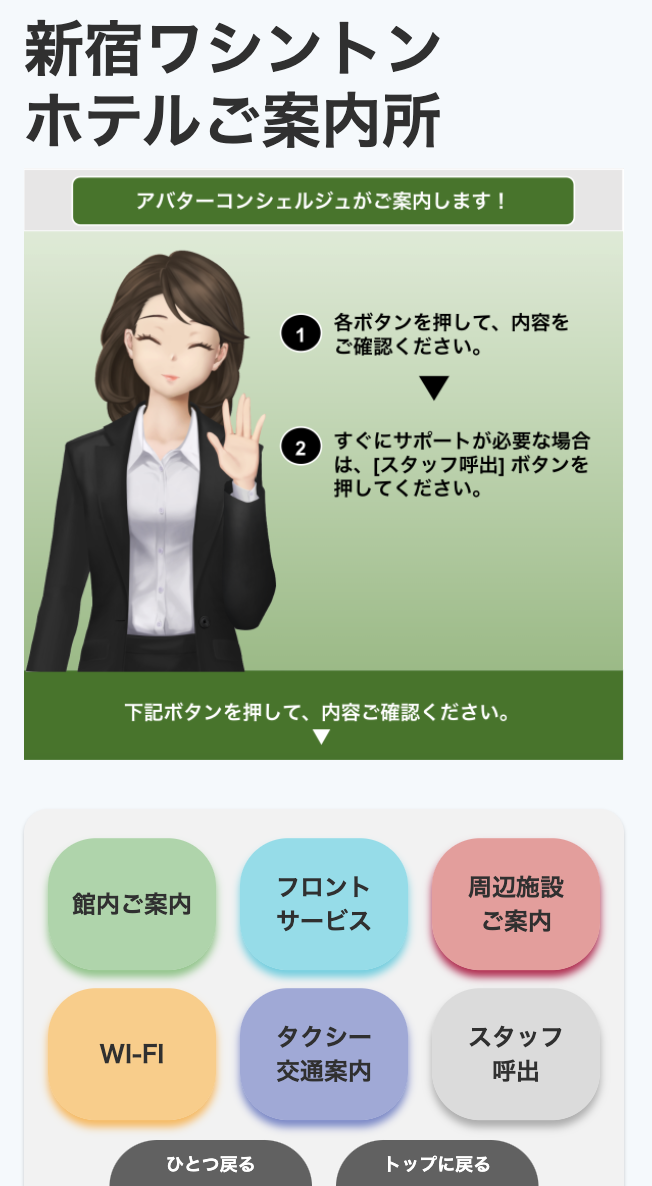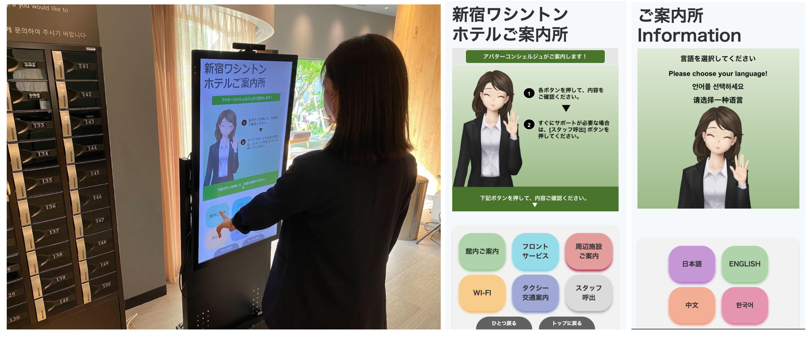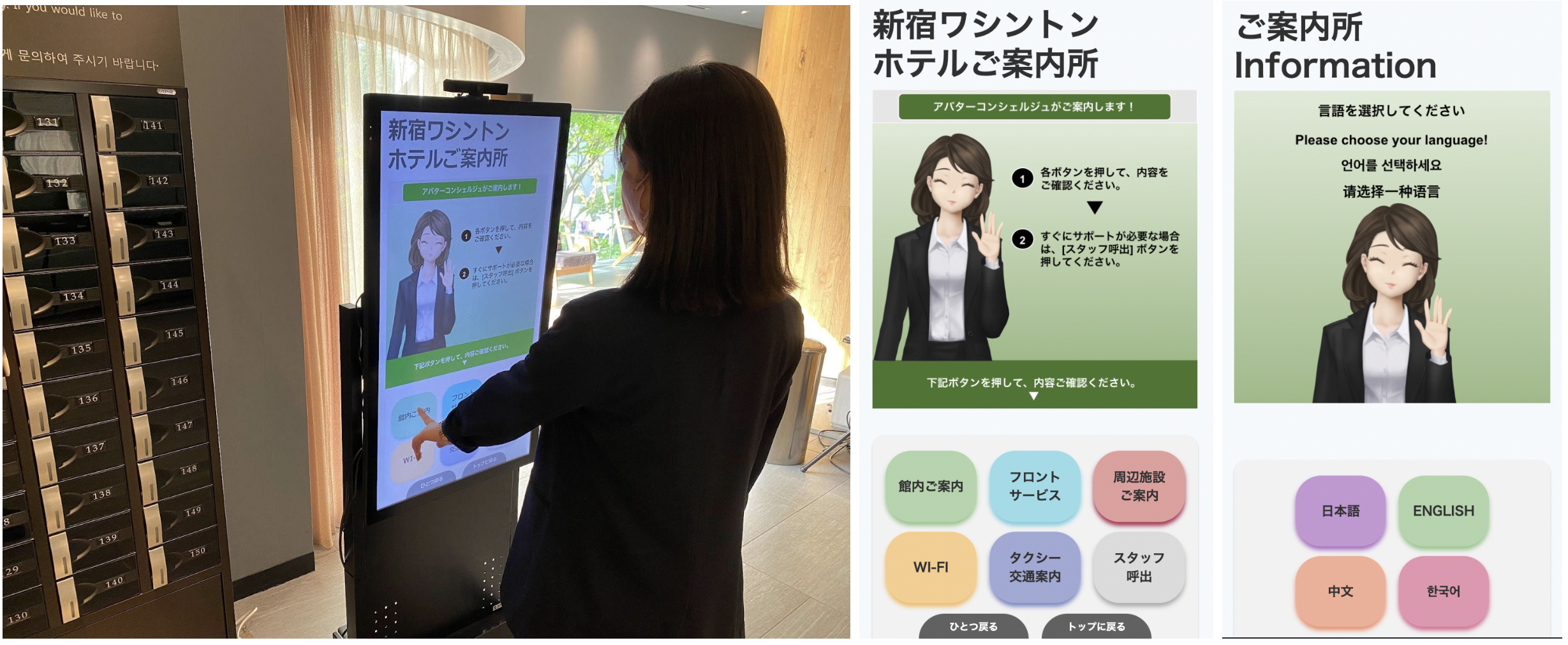 この度、ユーサイドユーはホテル向けのサービスとして「アバターコンシェルジュ」の提供を開始しており、新宿ワシントンホテル本館に2022年5月17日(火)からトライアル導入することとなりました。「アバターコンシェルジュ」については、宿泊者とのタッチポイントを低コストに増やしつつ、独自のシナリオ機能による自動案内とスタッフ案内の2段階のご案内による効率的な案内を実現します。