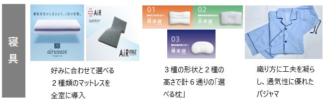 また、「快眠(=気持ちよく眠ること)」をお客様に提供するため、身体への負担を軽減し熟睡をサポートする「エアウィーヴ」社のマットレス、もしくは独自の凹凸構造により高い体圧分散性を実現した「nishikawa(西川)」社のAirマットレスを全室に配置し、お試し感覚でベッドを選べる(※)スタイルを当社チェーンホテルで初導入したことに加え、自身の体形や好みに合わせて選べる枕を導入するなど、「快眠」のこだわりをご提供いたします。