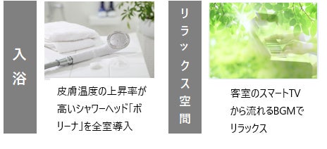 ・ウルトラファインバブル(0.0001mmの超微細気泡)が発生し、肌の表面温度が上がりやすく、良質な睡眠に繋がる体温調整を助けるシャワーヘッド「ボリーナ」を全室に導入