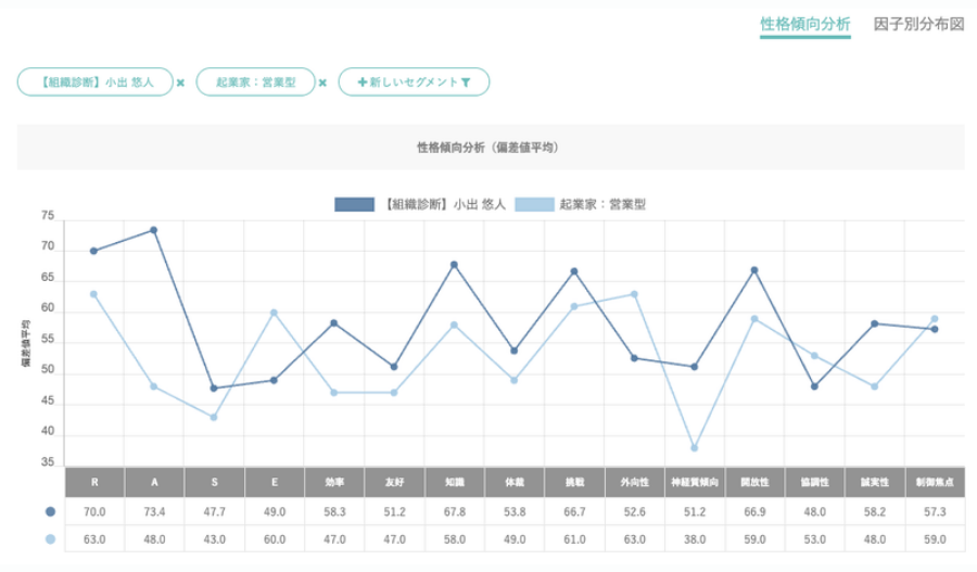 Jobgramに蓄積された数万件を超える「性格特性×パフォーマンスデータ」から、比較分析に役立つデータを抽出したものです。