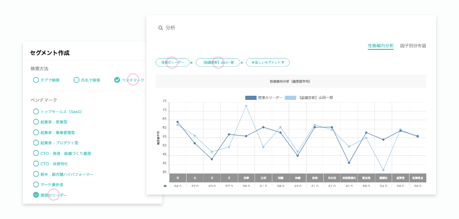 ベンチマークデータ機能が追加されたことにより、他社データと自社メンバー・候補者データを簡単に比較分析することが可能になり、採用の要件定義への活用、個人のポテンシャルの予測、最適配置などに活用できます。