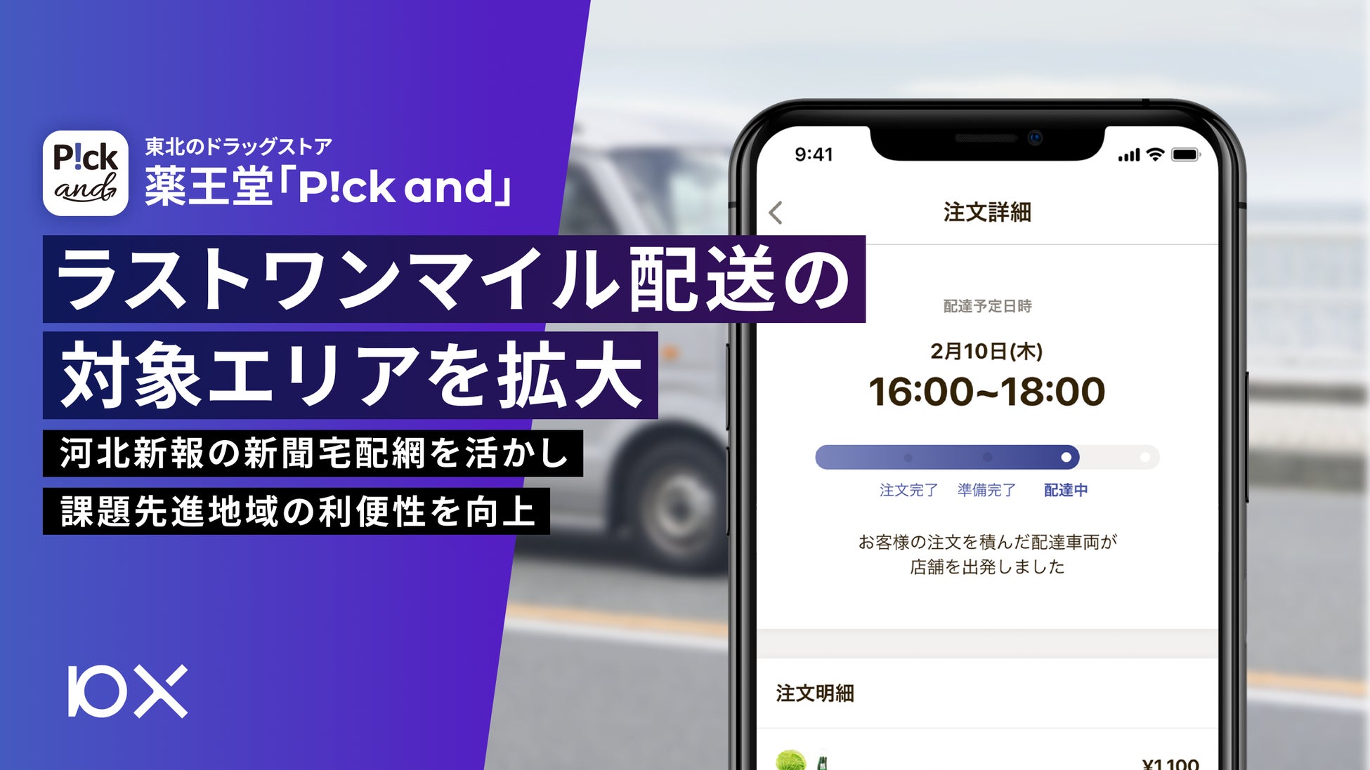 株式会社10X(本社:東京都中央区、代表取締役CEO 矢本 真丈、以下10X)は、同社が小売ECプラットフォーム「Stailer(ステイラー)」を通じて提供する薬王堂「P!ck and」アプリにて、河北新報の新聞宅配網を活用したラストワンマイル配送の対象エリアを、2022年10月4日よりさらに拡大します。同年2月1日より仙台泉館店にて開始している本サービスの対象店舗に、仙台泉紫山店、古川福浦店、栗原若柳店の3店舗を新たに追加します。