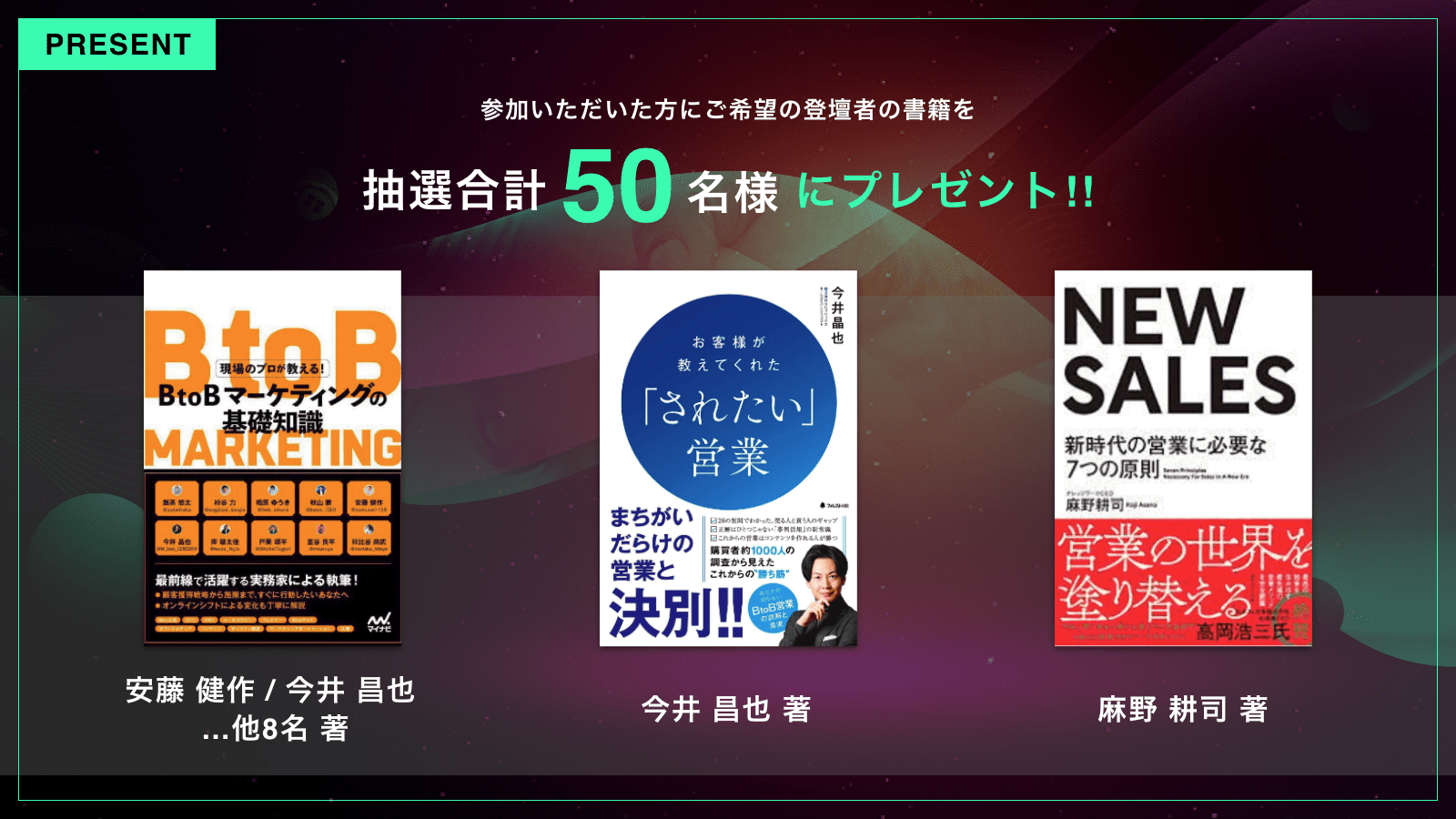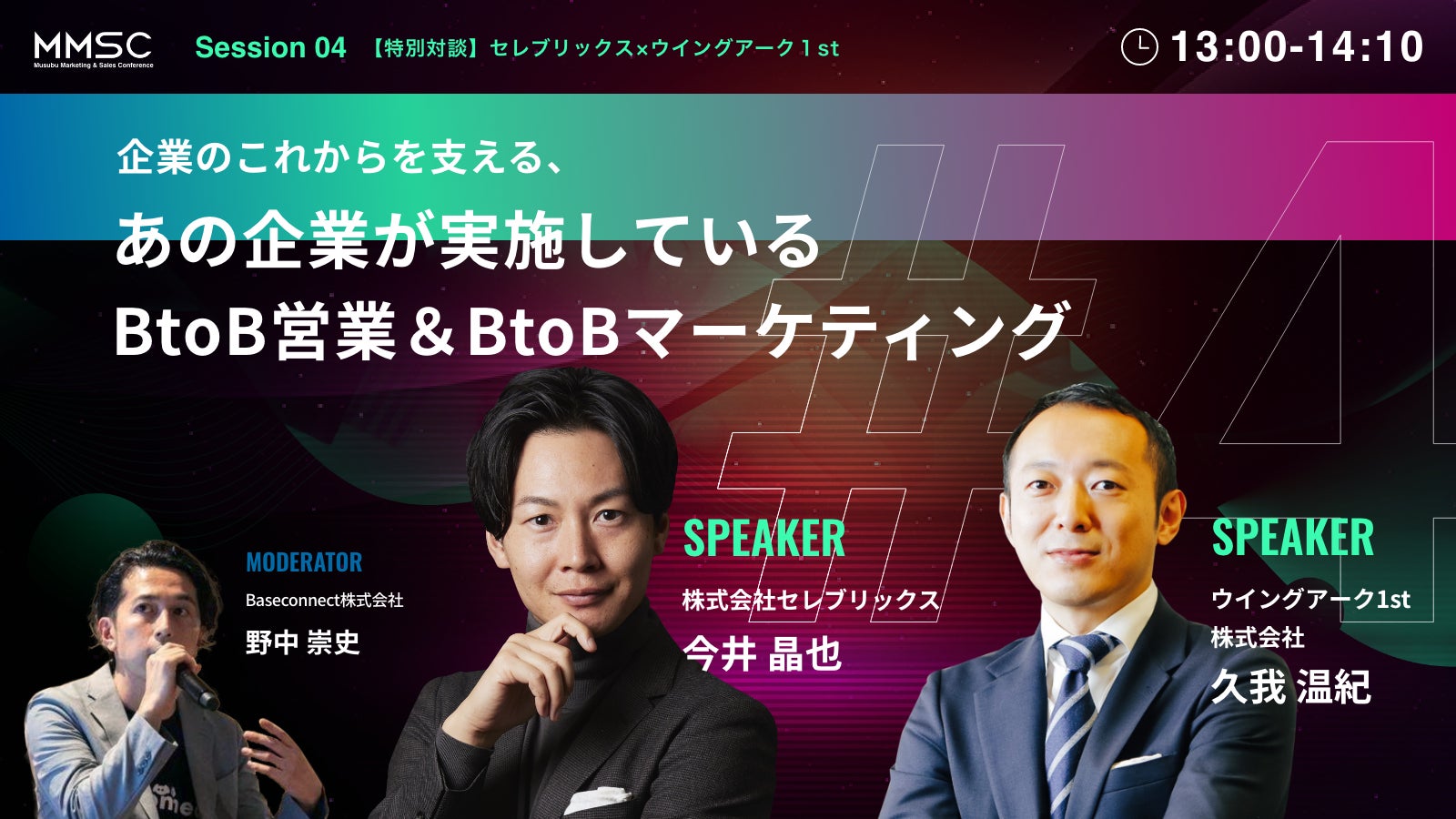 | 13:00-14:10 | 特別対談『企業のこれからを支える、 あの企業が実施しているBtoB営業&BtoBマーケティング』 今井 晶也 氏 - 株式会社セレブリックス セールスカンパニー 執行役員 カンパニーCMO /セールスエバンジェリスト 久我 温紀 氏 - ウイングアーク1st株式会社 執行役員 マーケティング本部 本部長 |