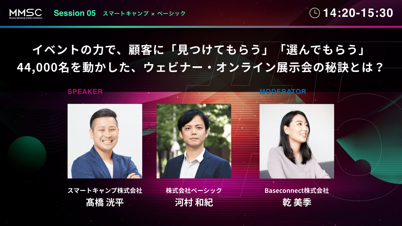 | 14:20-15:30 | 『イベントの力で、顧客に「見つけてもらう」「選んでもらう」44,000名を動かした、ウェビナー・オンライン展示会の秘訣とは?』 髙橋 洸平 氏 - スマートキャンプ株式会社 執行役員 EVENTカンパニー管掌 河村 和紀 氏 - 株式会社ベーシック Ferret One事業部 マーケティング部 イベントマーケティング責任者 |