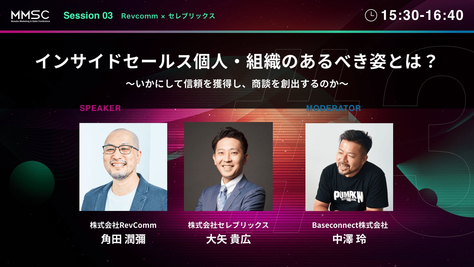 | 15:30-16:40 | 『インサイドセールス個人・組織のあるべき姿とは? 〜いかにして信頼を獲得し、商談を創出するのか〜』 角田 潤彌 氏 - 株式会社RevComm Head of Sales/CS/Alliance 大矢 貴広 氏 - 株式会社セレブリックス セールスカンパニー B2Bマーケティング支援事業部 部長 |