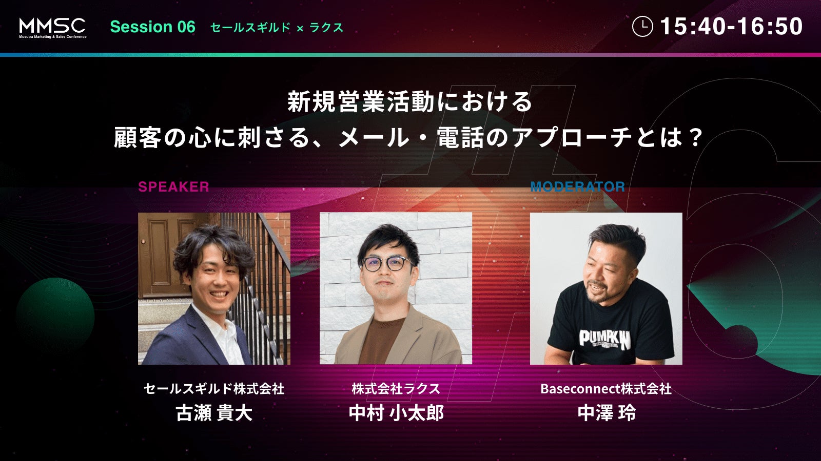 | 15:40-16:50 | 『新規営業活動における、顧客の心に刺さる「メール・電話のアプローチ」とは?』 古瀬 貴大 氏 - セールスギルド株式会社 代表取締役 中村 小太郎 氏 - 株式会社ラクス クラウド事業本部 配配メール事業部 インサイドセールス チームリーダー |