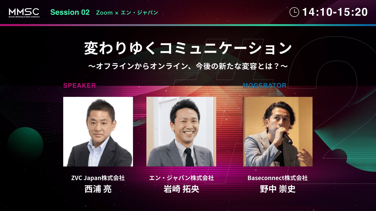 | 14:10-15:20 | 『変わりゆくコミュニケーション 〜オフラインからオンライン、今後の新たな変容とは?〜』 西浦 亮 氏 - ZVC Japan株式会社 執行役員 ゼネラルビジネス営業本部 本部長 岩崎 拓央 氏 - エン・ジャパン株式会社 取締役 |