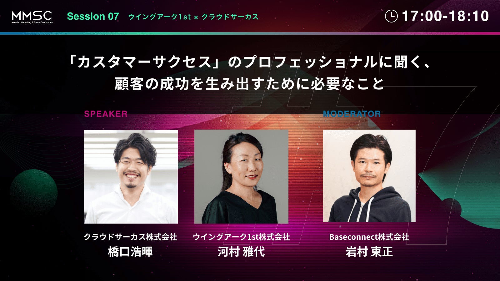 | 17:00-18:10 | 『「カスタマーサクセス」のプロフェッショナルに聞く、顧客の成功を生み出すために必要なこと』 橋口 浩暉 氏 - クラウドサーカス株式会社 Fullstar プロダクトマネージャー/Head of product operations 河村 雅代 氏 - ウイングアーク1st株式会社 マーケティング本部 TOFD部 カスタマーマーケティンググループマネージャー |