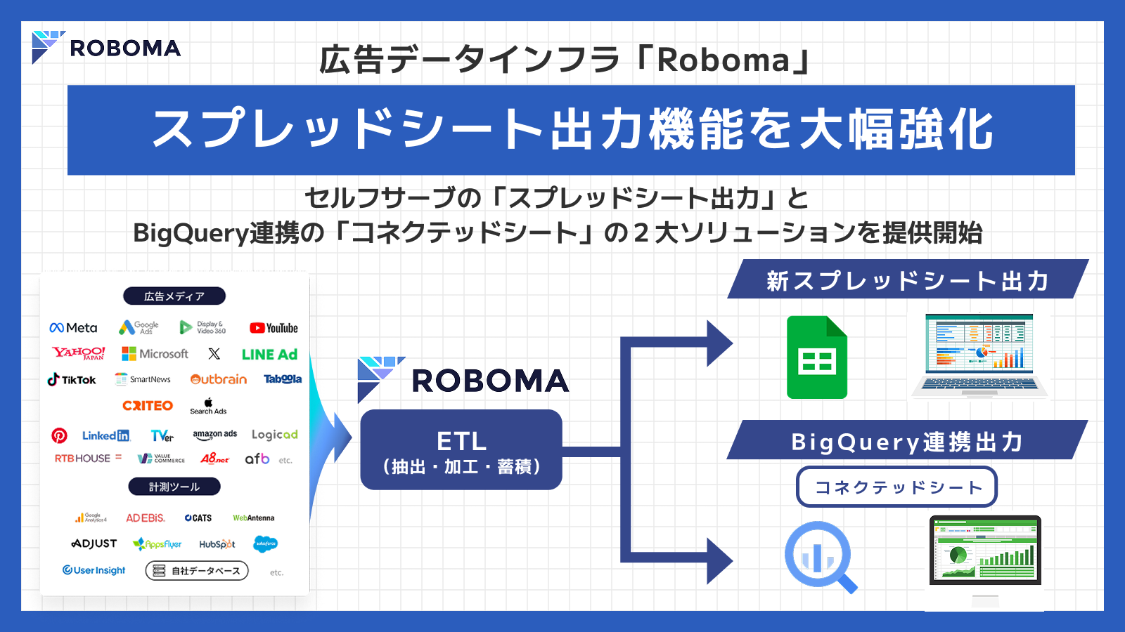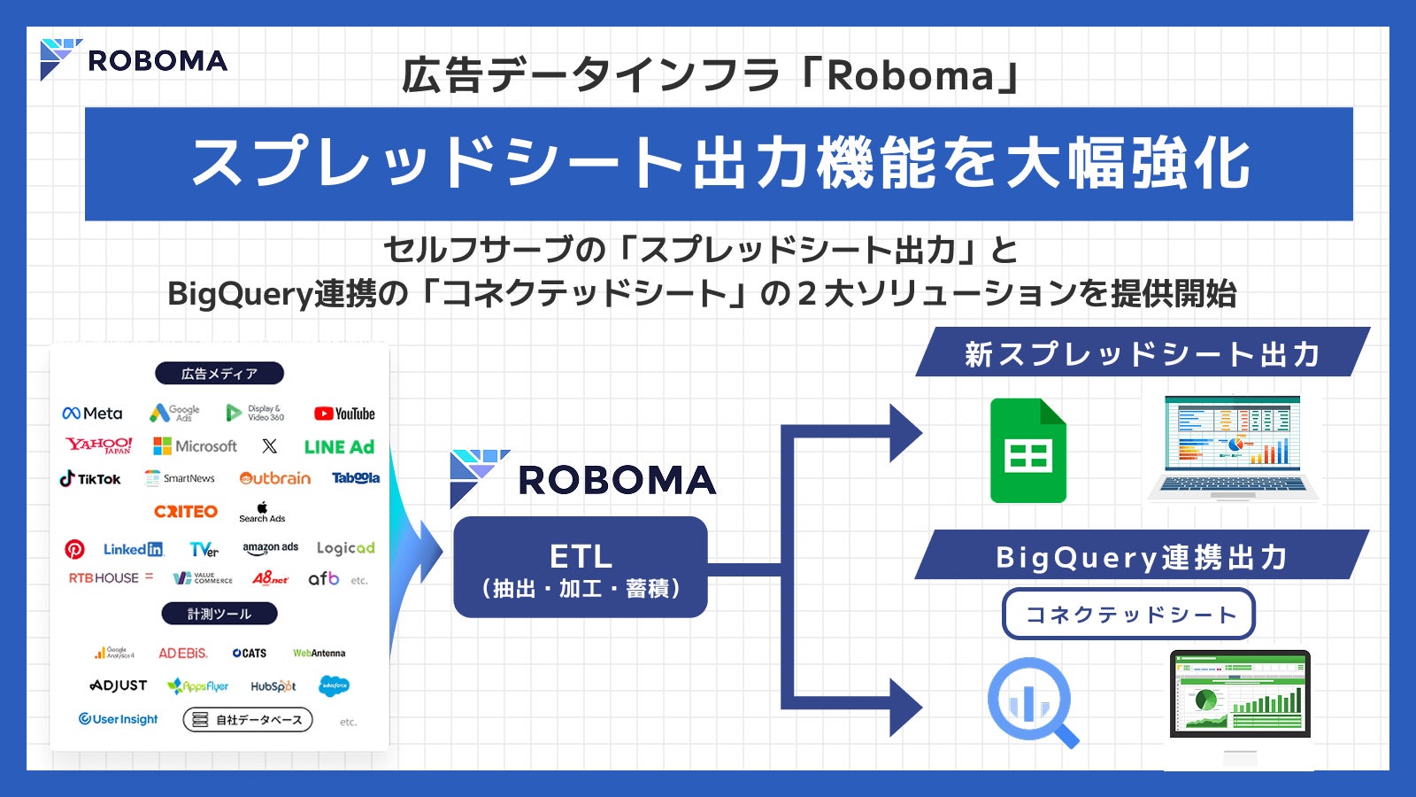 広告データインフラ「Roboma(ロボマ)」がスプレッドシート出力機能を大幅強化、セルフサーブの出力機能と BigQuery 連携「コネクテッドシート」の構築ソリューションを提供開始