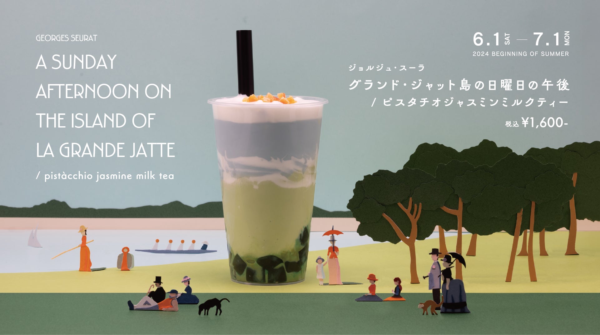 有名絵画からインスパイアを得て生まれる"飲む名画"『ART mock drink(アートモック・ドリンク)』に、ジョルジュ・スーラの作品から着想した、ピスタチオジャスミンミルクティーが加わります。