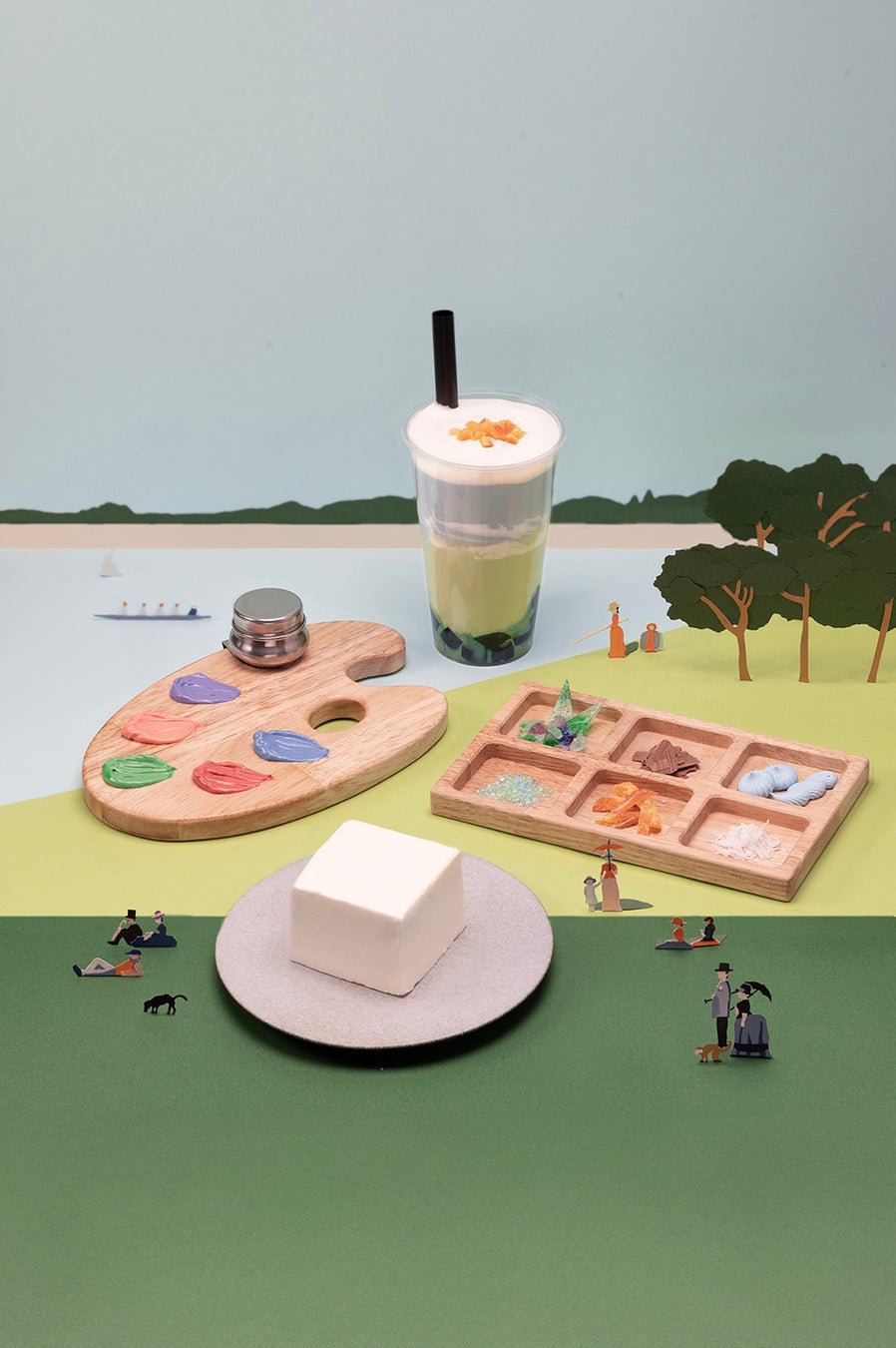 ジャスミンミルクティーにはパタフライピーで着色し、夏の避暑地の芝生と青空の色を整然と重ねることで、スーラの作品全体に流れる静けさをイメージしました。
